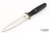 This Applegate-Fairbairn Combat Dagger from Al Mar Knives has a mirror polished double edged blade with .171" blade stock and 1.079" blade depth, hidden tang construction. The handle is comprised of a brass double guard and black zytel handle. Lanyard Hole in pommel. Has a couple light scratches, otherwise excellent condition. Comes with a zippered case.