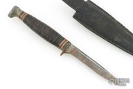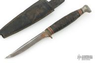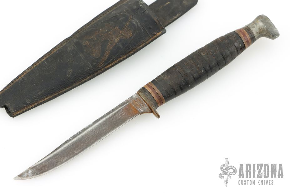 This USMC Fighter from Ka-Bar Knives has a satin-finished clip point blade with .115" blade stock and .493" blade depth, hidden tang construction. The handle has a brass guard and aluminum butt with stacked leather handle. Has scuffs, scratches, and patina. Fair condition; good condition for its age.