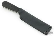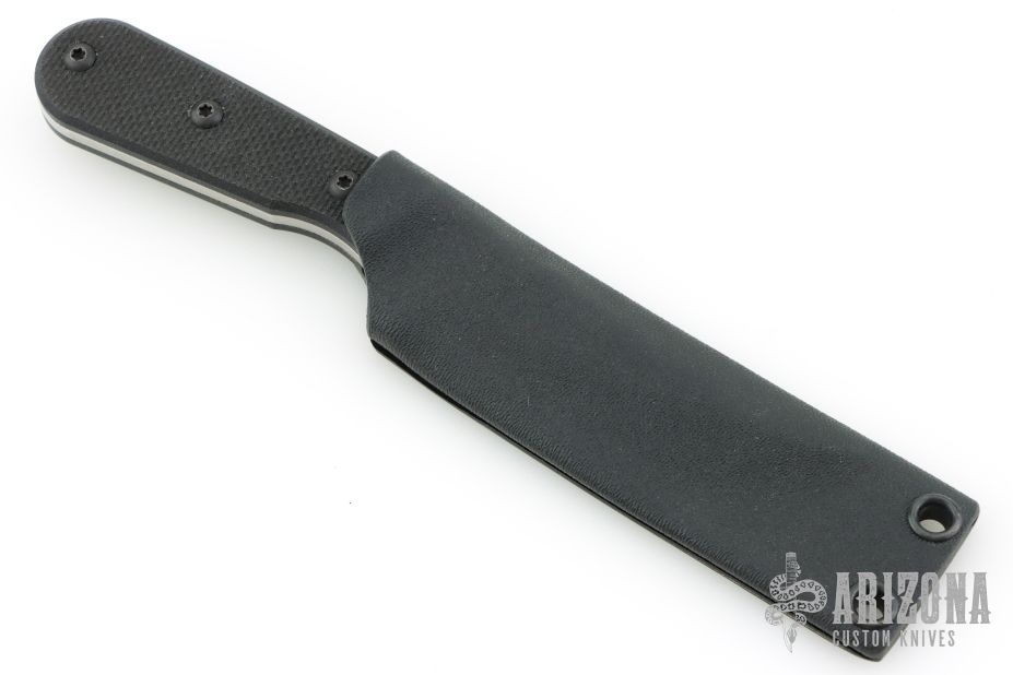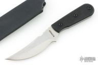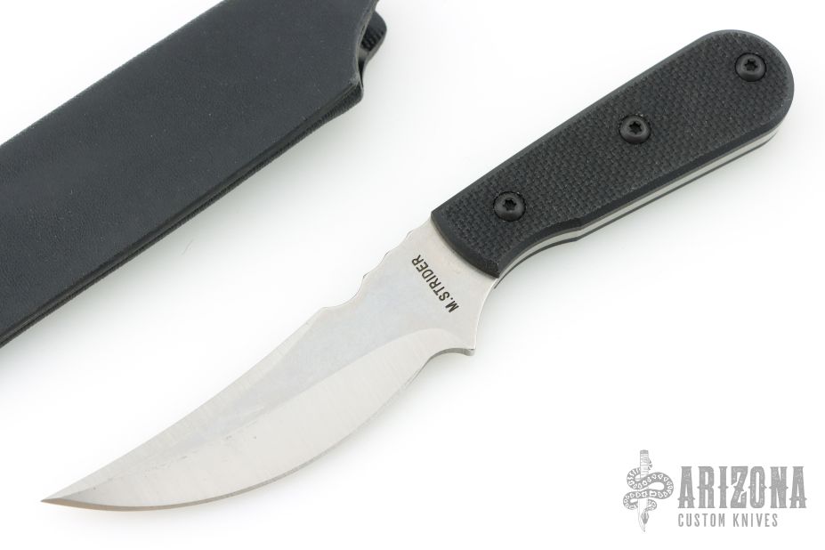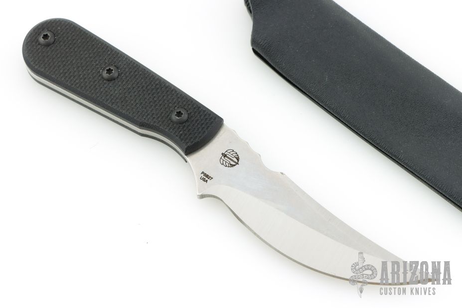 This Persian Steak Knife by Mick Strider features an upswept PSB27 Steel blade with false top edge and notched thumbrest, .159" blade stock and .953" blade depth, full tang construction. The handle has black G-10 scales. Comes with a kydex sheath. New condition.