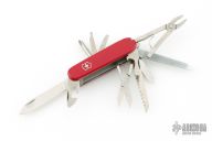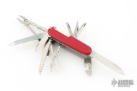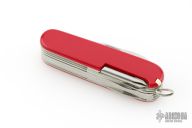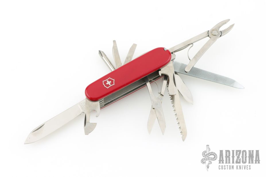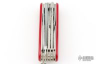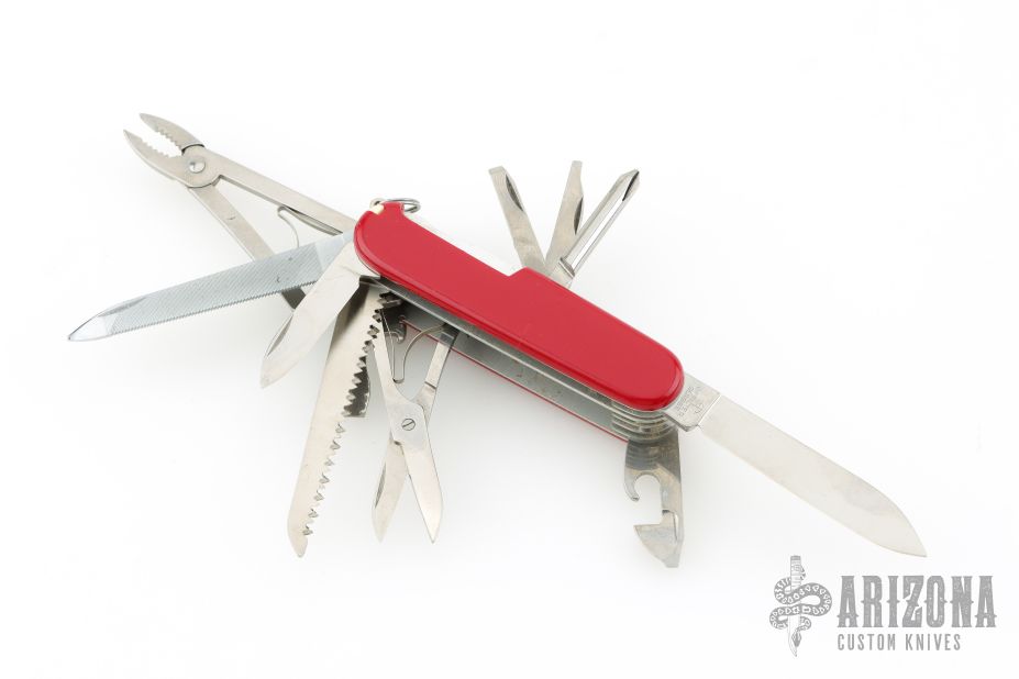 This Victorinox knife features polished blades, tools and scissors.  The handle features red plastic scales over steel liners/backsprings. "Officier Suisse" on the blade. Silver inlaid escutcheon. Comes with original box and papers. Has some scratches/patina, otherwise great condition.