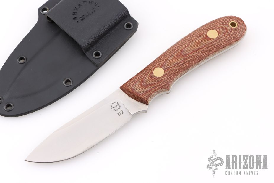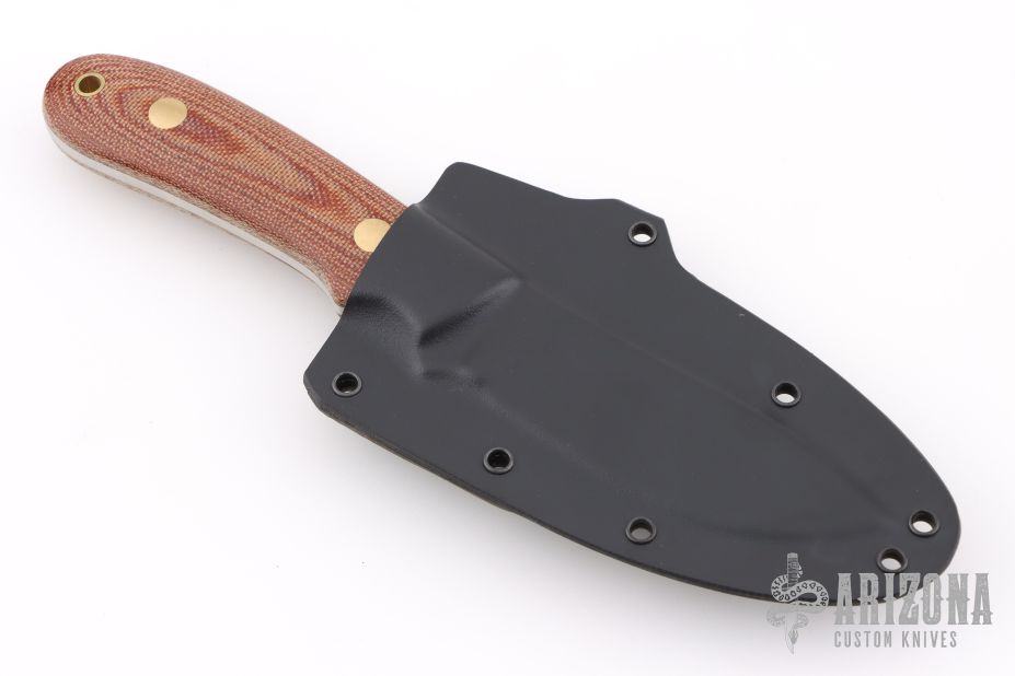 This K-2 General Purpose Knife by Dozier Knives features a satin finished blade with .132" blade stock and 1.038" blade depth, full tang construction. The handle has natural canvas micarta scales with brass pins and lanyard hole. Comes with kydex sheath with belt clip. New from maker.
