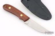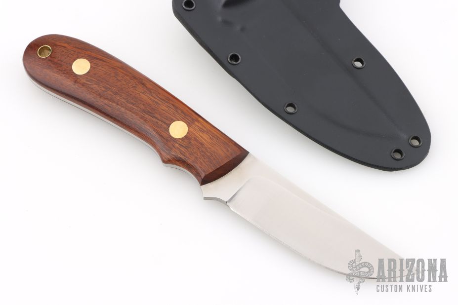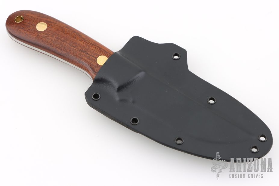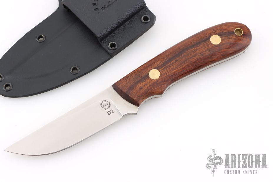 This K-4 Straight Hunter by Dozier Knives features an upswept satin finished blade with .131" blade stock and .982" blade depth, full tang construction. The handle has desert ironwood burl scales with brass pins and lanyard hole. Includes kydex sheath. New from maker.