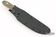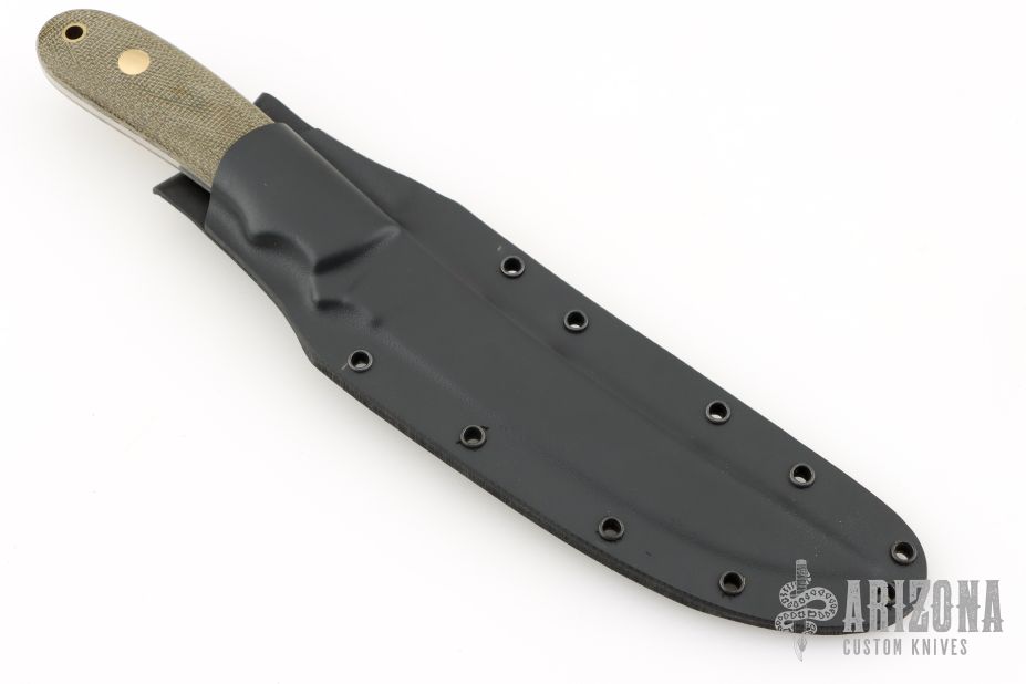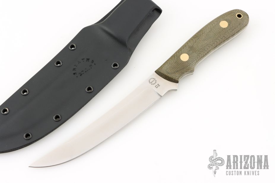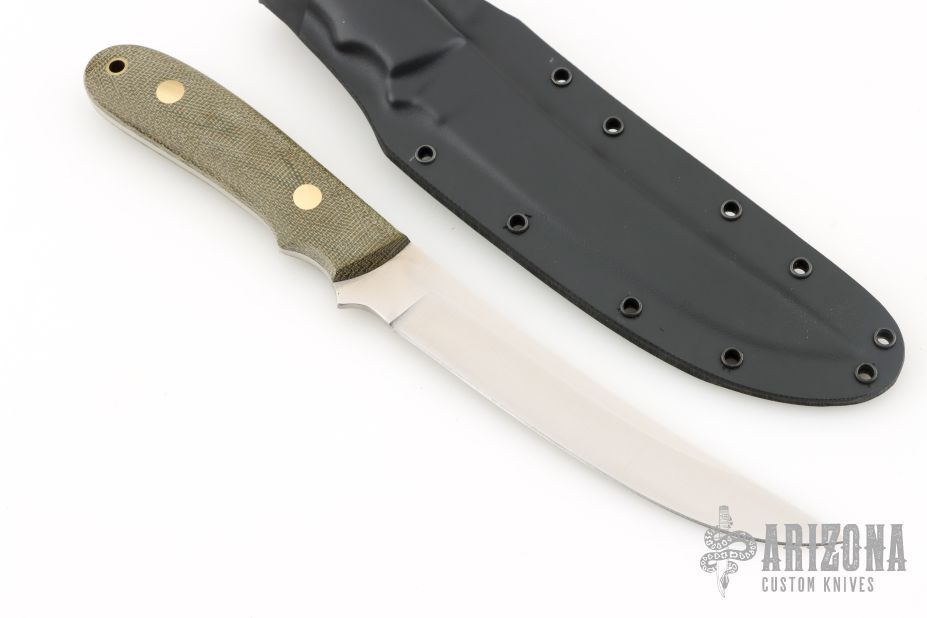 This K-23 Fillet by Dozier Knives features an upswept satin finished blade with .125" blade stock and .921" blade depth, full tang construction. The handle has green canvas micarta scales with brass pins and lanyard hole. Comes with a kydex sheath. New from maker.