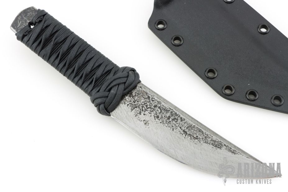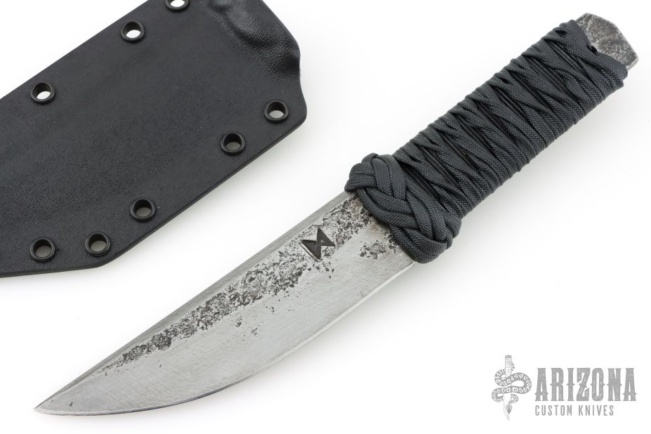 This knife by James Helm features a hand forged blade, .240" blade stock and 1.401" blade depth, hidden tang construction. The handle has a paracord wrap that has been epoxied. Comes with a kydex sheath set up for TekLok. Excellent condition.