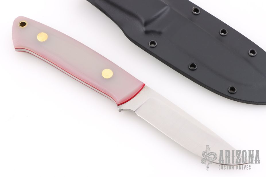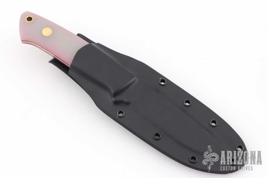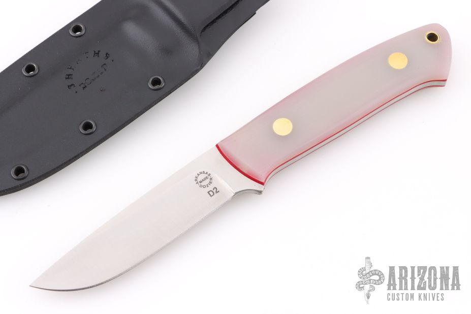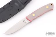 This K-22 Buffalo River Hunter by Dozier Knives features a satin finished blade with .133" blade stock and .906" blade depth, full tang construction. The handle has natural G-10 scales with red liners and brass pins and lanyard hole. Comes with kydex sheath with belt clip. New from maker.