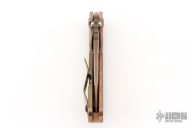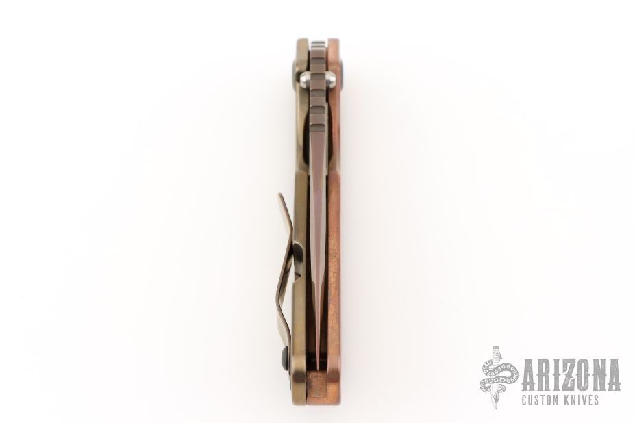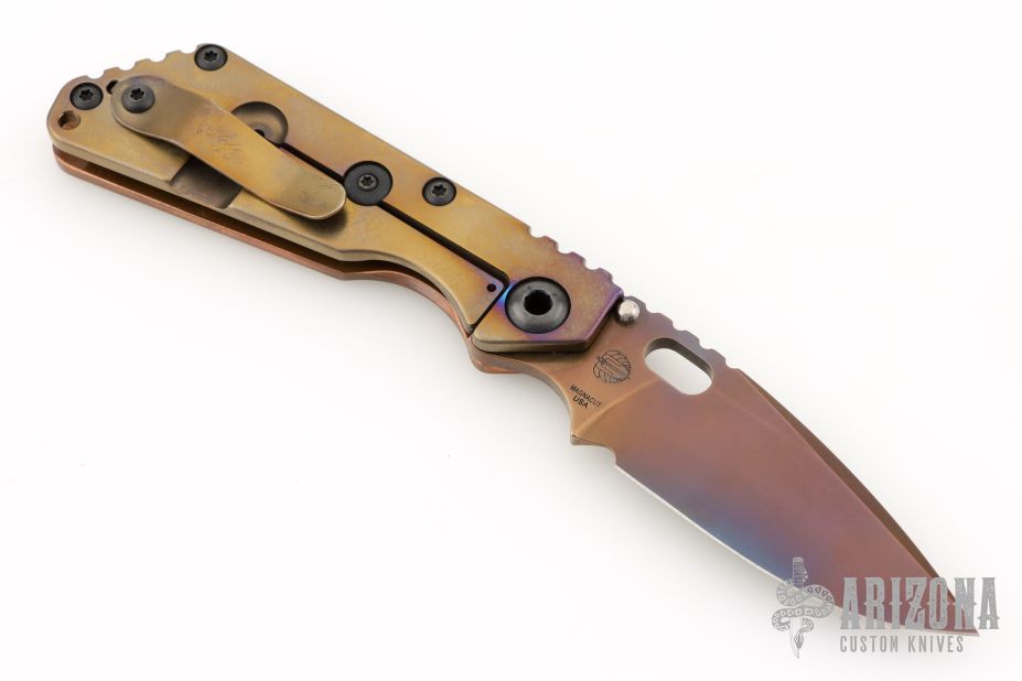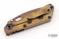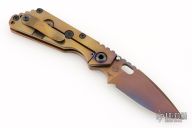 This Mick Strider SNG framelock folder features a heat color finished spear point blade with thumbhole and notched thumbrest. The handle has a copper and orange peel finished anodized titanium frame with titanium clip, tip up carry. Jimping on blade spine. Includes Hinderer "Lock Bar Stabilizer" for maximum reverse lock retention. Nice detent, lockup and blade seating. Excellent condition. Comes with a zippered case.