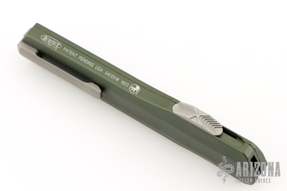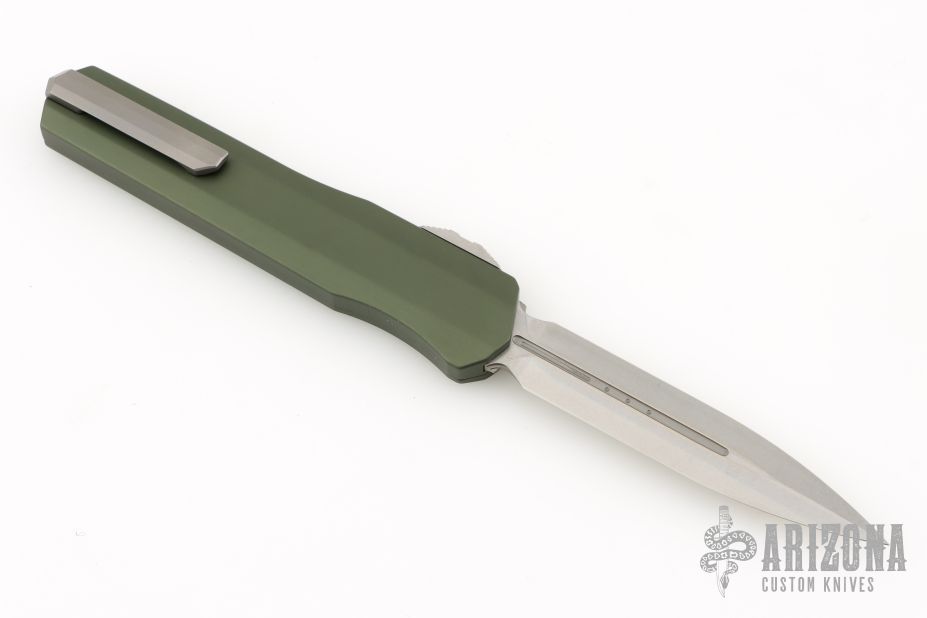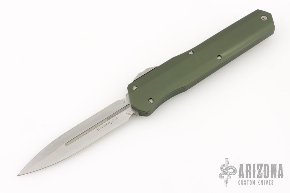This Cypher OTF is a collaboration between Anthony Marfione and DC Monroe. It features a stonewash double-edged blade with standard edges. The handle has a OD green aluminum handle with bead blasted hardware, and a titanium tip down clip and a titanium insert at the butt. Comes with original box and papers.   There are several light scuffs on the handle otherwise the knife is in excellent condition.  S/N 1923.  Dated 04/2018.