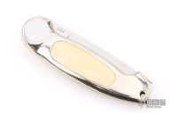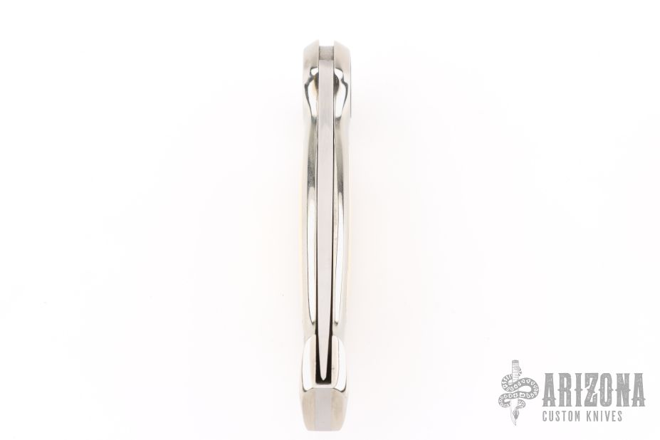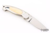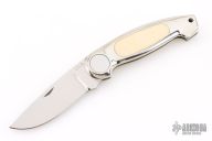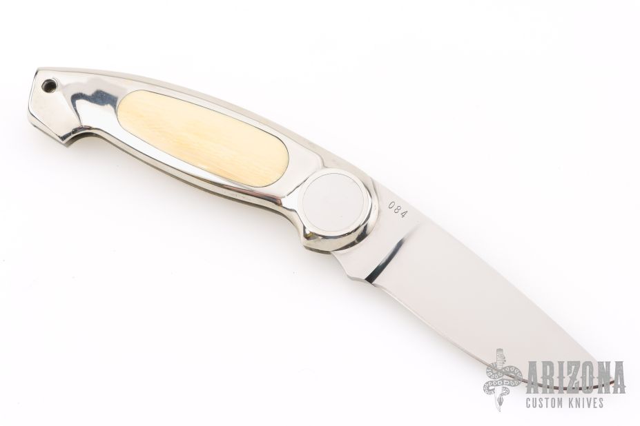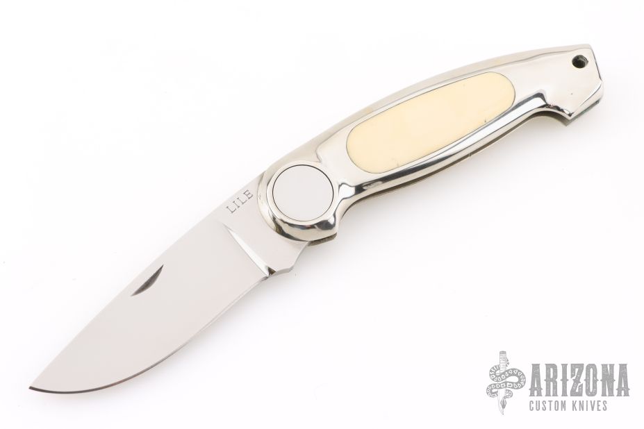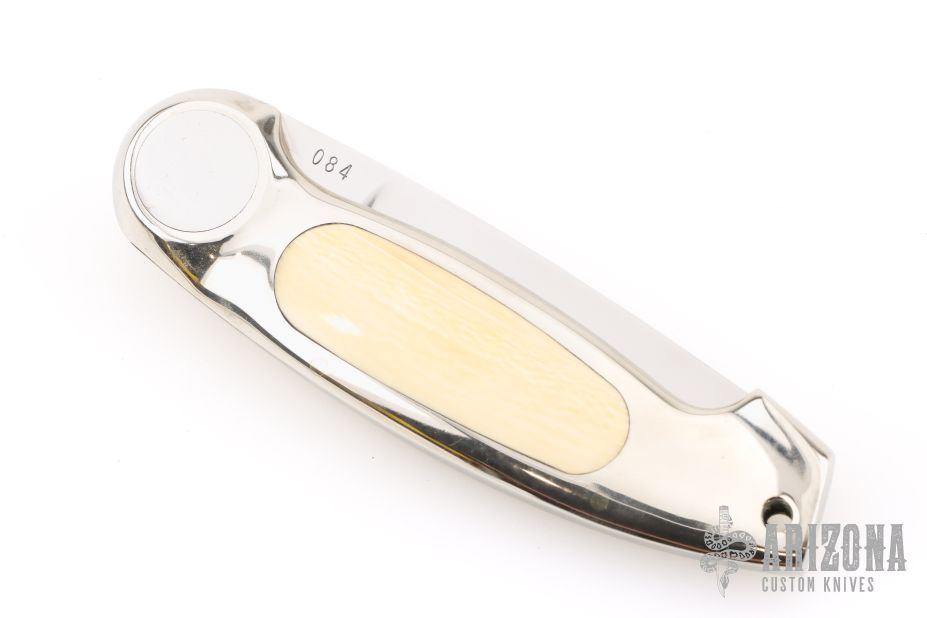 This Button Lock Folder from Jimmy Lile features a satin finished blade with nail nick, #084 on blade. The handle has a nickel silver frame with mammoth ivory inlays. Large button lock release mechanism used to open and close the knife. Numbered "83" on inside of backspacer. Excellent condition.