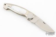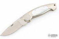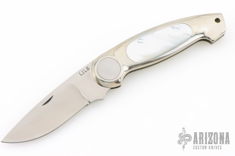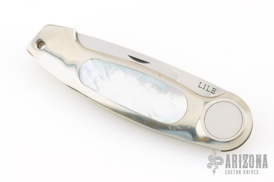 This Button Lock Folder from Jimmy Lile features a satin finished blade with nail nick, #080 on blade. The handle has a nickel silver frame with mother of pearl inlays. Large button lock release mechanism used to open and close the knife. Numbered "80" on inside of backspacer. Excellent condition.