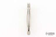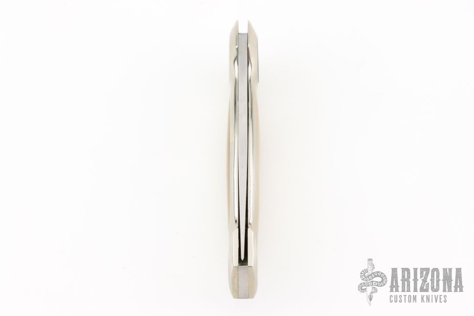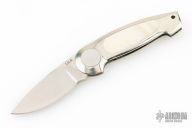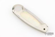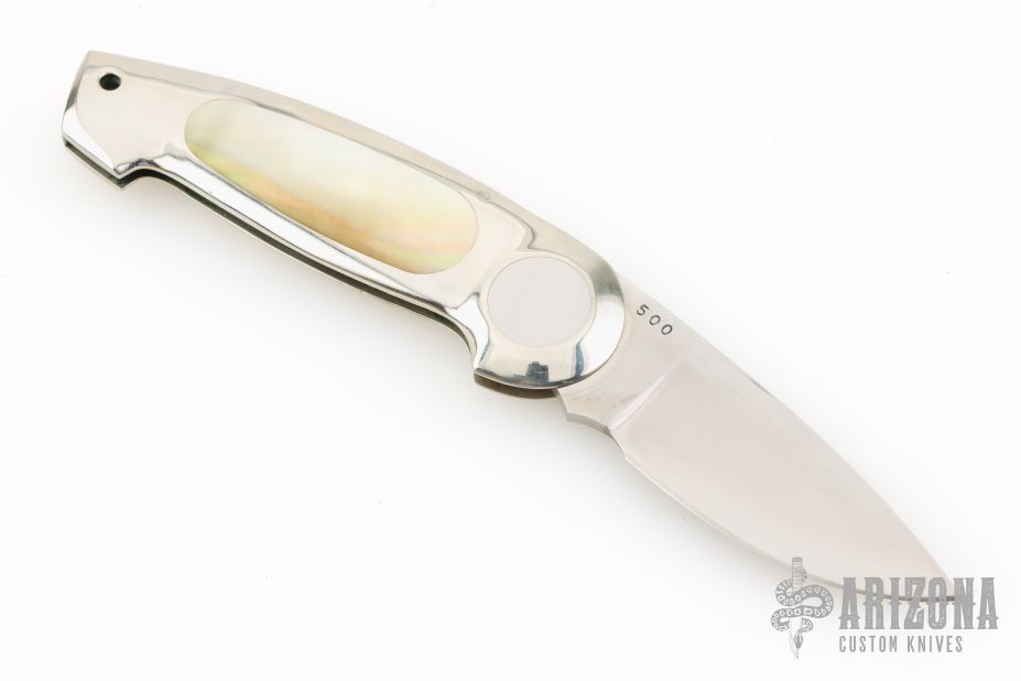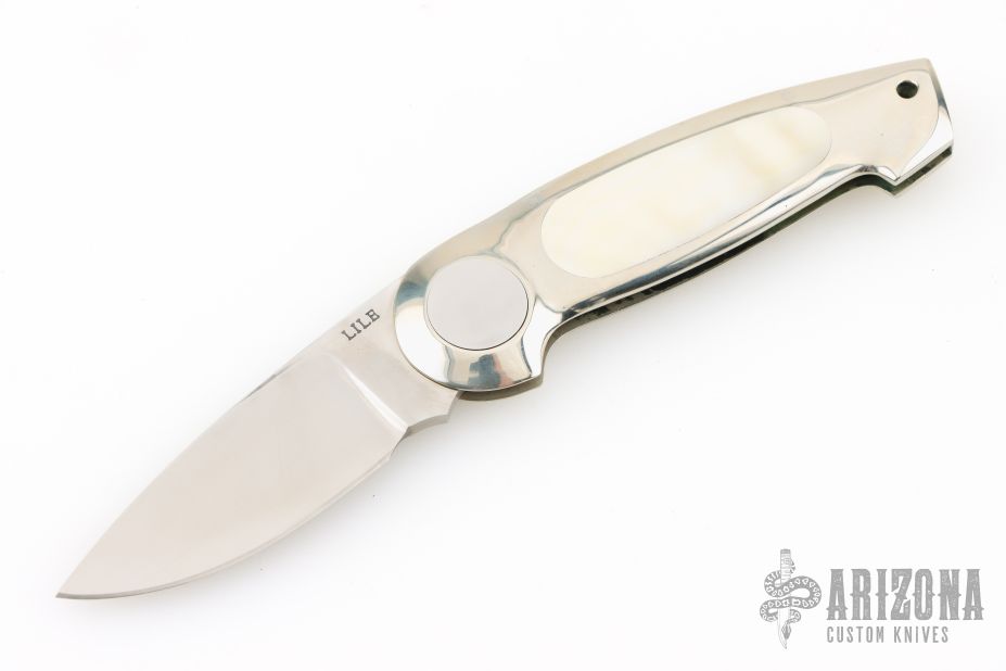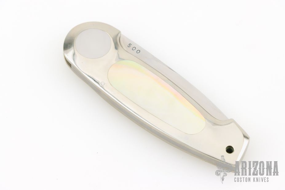 This Button Lock Folder from Jimmy Lile features a satin finished blade with nail nick, #500 on blade. The handle has a nickel silver frame with gold lip pearl inlays. Large button lock release mechanism used to open and close the knife. Dated "1987 U.S. PAT# 4148140" on inside of backspacer. Excellent condition.