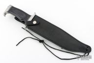 With styling reminiscent of early Hibben bowies, this Hibben Survivor Bowie knife is the ultimate jungle warrior. This massive knife offers a 10” razor-sharp 7Cr17 stainless steel blade with powerful sawback teeth. The black pakkawood handle offers a solid, ergonomic grip as the polished hand guard protects your hand from slipping to the blade. Lashing holes are pre-drilled in the guard and pommel to allow for spear making by lashing the knife to a long, wooden handle. Includes a custom leather belt sheath with the Hibben Custom Design logo stamped right into the leather and a certificate of authenticity.