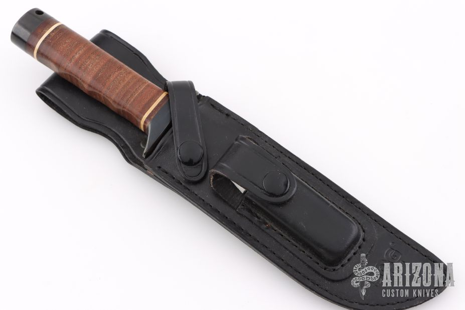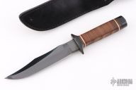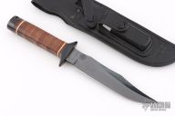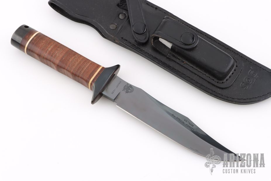 This S1 Bowie (Vietnam 5th Special Forces Group) has a black coated clip point blade with hidden tang and double guard. Blade width is just under 1/4", depth 1-1/4". Handle is contoured stacked leather with white spacers, black coated steel butt cap and lanyard hole. Comes with a black leather sheath. Very Rare. Blade is marked "SOG SPECIALTY KNIVES" on the presentation side. The non-presentation side has the Special Forces crest on the ricasso and "VIETNAM 5th Special Forces Group" on the swedge.  Comes with original sheath. Has a couple light scratches, otherwise excellent condition. SK5 Steel.