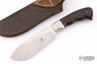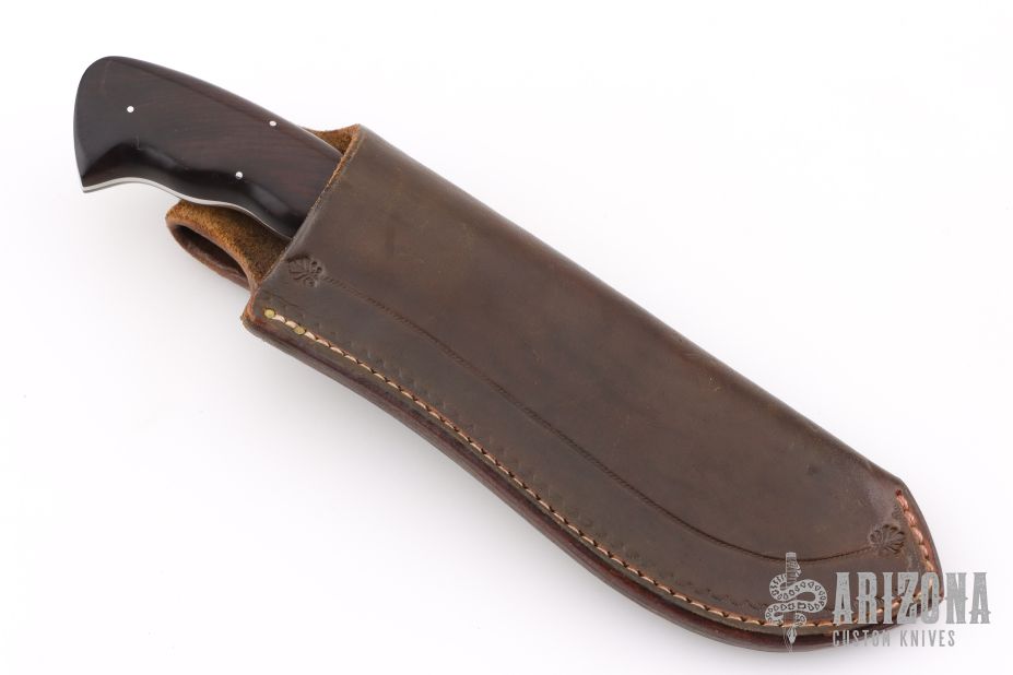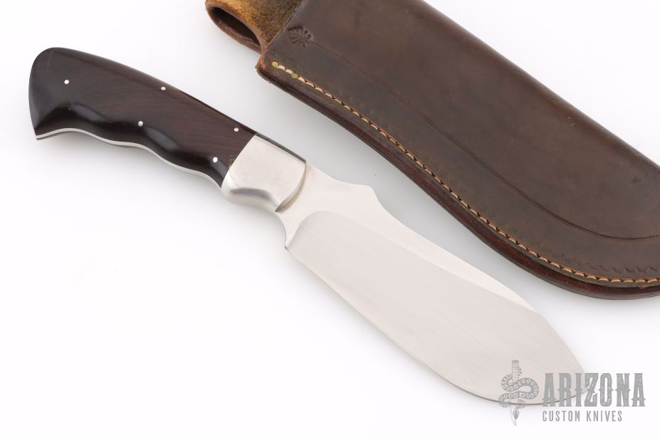 This Rhino skinner by Arno Bernard features a hand rub satin finished blade with mirror polished flats, .164" blade thickness and 1.566" blade depth, full tapered tang construction. The handle has stainless steel bolsters and cocobolo scales. Comes with a brown leather sheath. Has a couple light scratches, otherwise excellent condition.