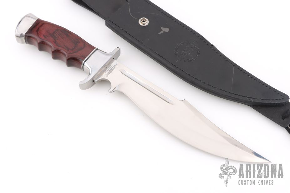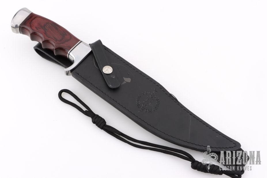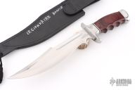 Gil Hibben has a history of designing knives for Sylvester Stallone to feature in his films, going back to the Rambo III Bowie. The custom-designed bowie, the Legionnaire, is one of his exceptional movie knives and, now, he releases a second version. A rich dark brown pakkawood handle complements the mirror-polished finish of the guard and pommel. The bowie knife has a keenly sharp, 9 1/2" 7Cr17 stainless steel blade, also, with a mirror-polished finish. A premium leather belt sheath protects the blade and provides a comfortable option of carry.