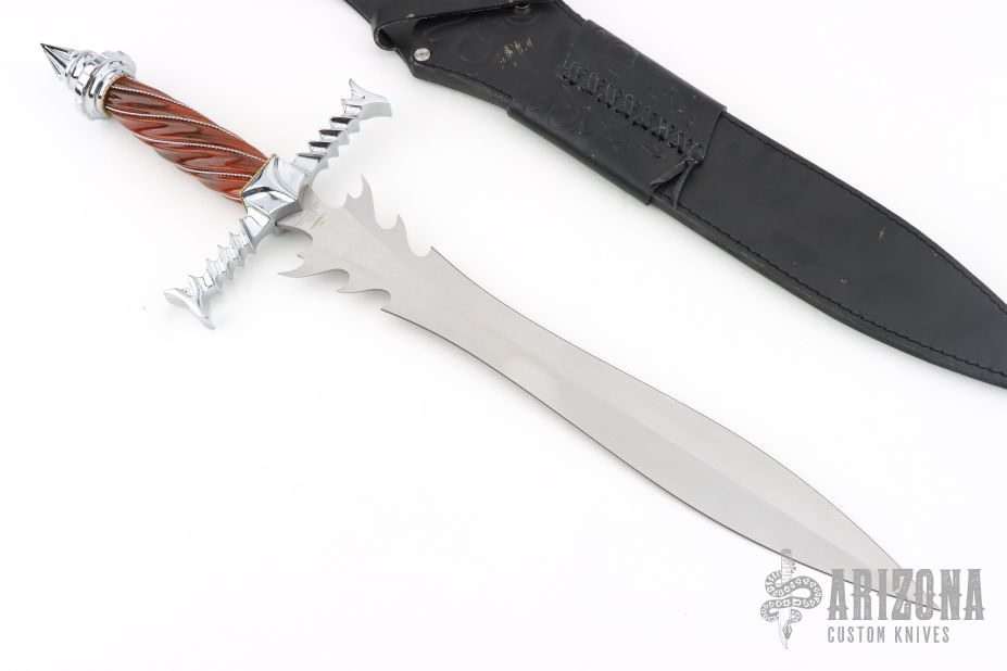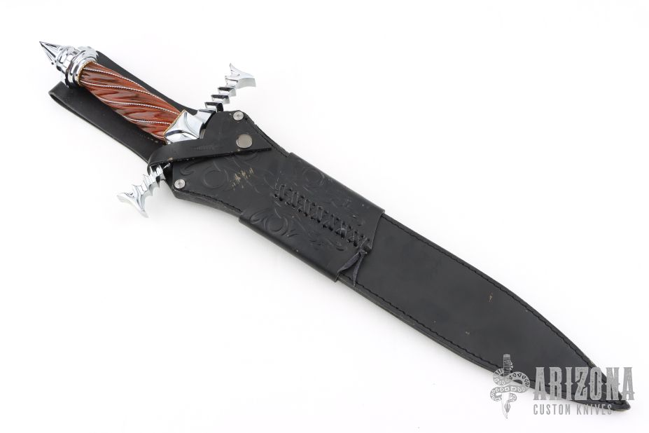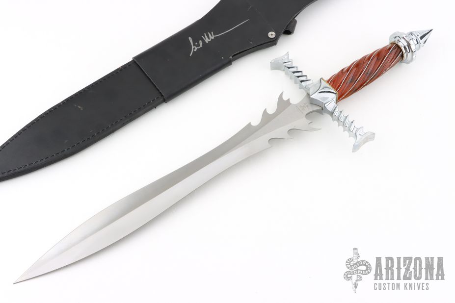 The Immortal, the seventeenth edition in the Hibben Annual Fantasy Knife Series, ushers in a new era of the Hibben fantasy knife with its chrome plated solid metal handle parts and imitation amber grip accented with stainless steel twisted wire wrap. The Immortal Autographed Edition is strictly limited to 3000 individually serialized pieces and is presented with an imitation leather sheath personally autographed by the knife's creator, Gil Hibben.