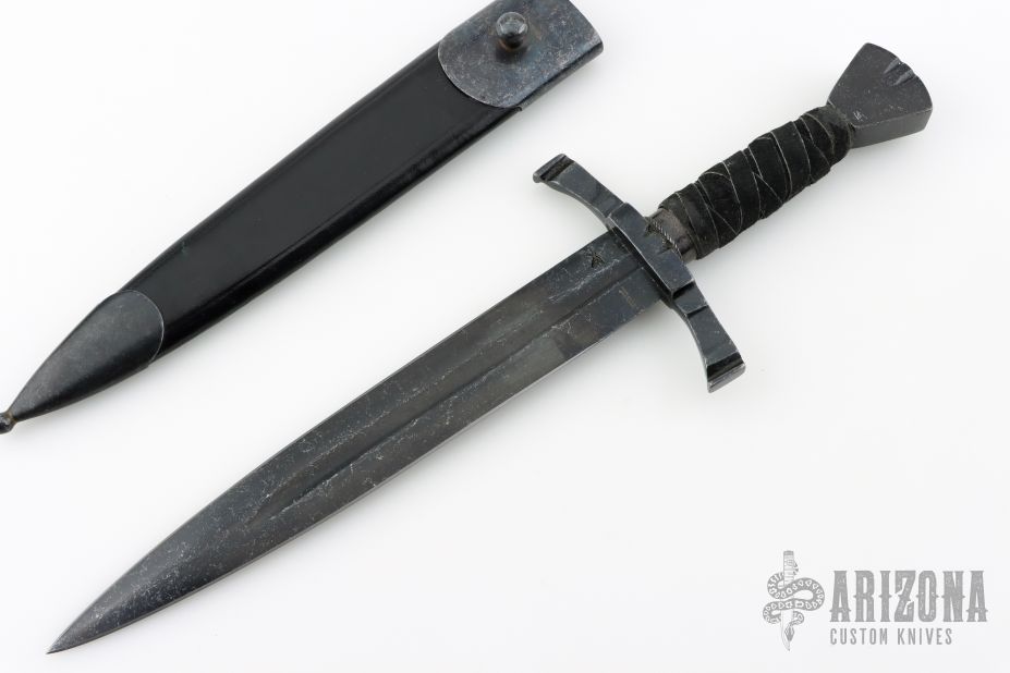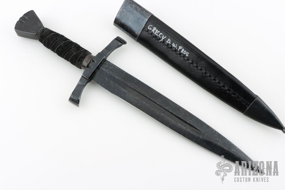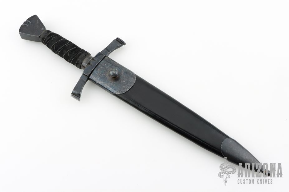 This dagger by Windlass Steelcrafts features a black stonewashed double edged blade with fullers, .178" blade stock and 1.380" blade depth, hidden tang construction. The handle has a black stonewashed steel guard and butt with filework, leather wrapped grip. Comes with original black leather sheath with black stonewashed fittings. Excellent condition.