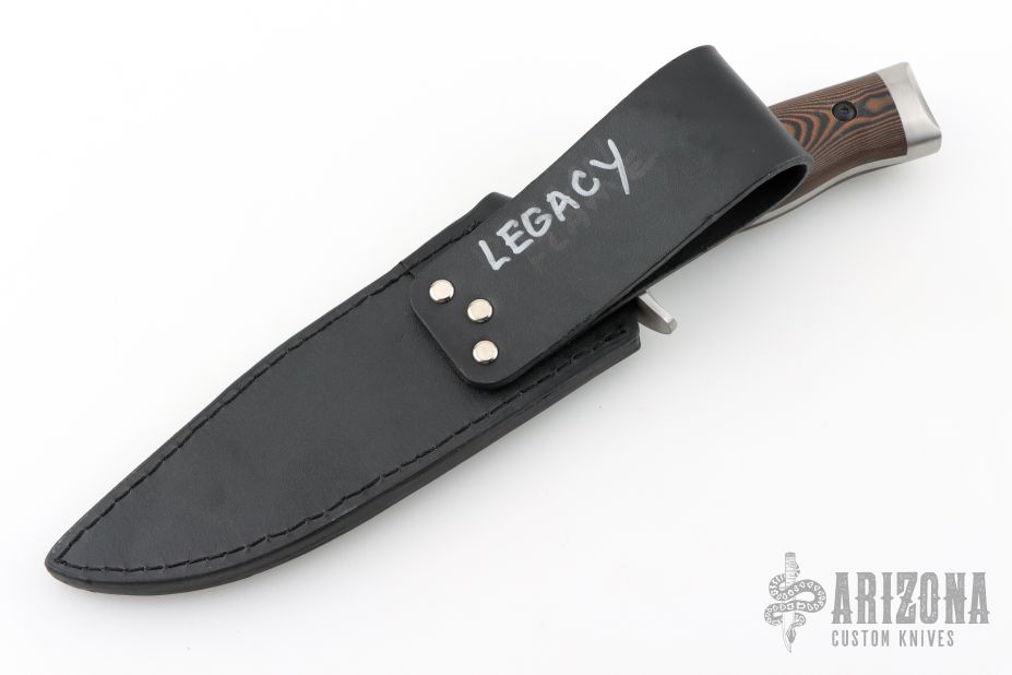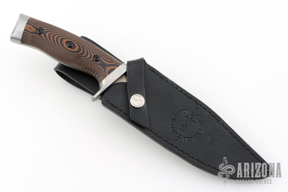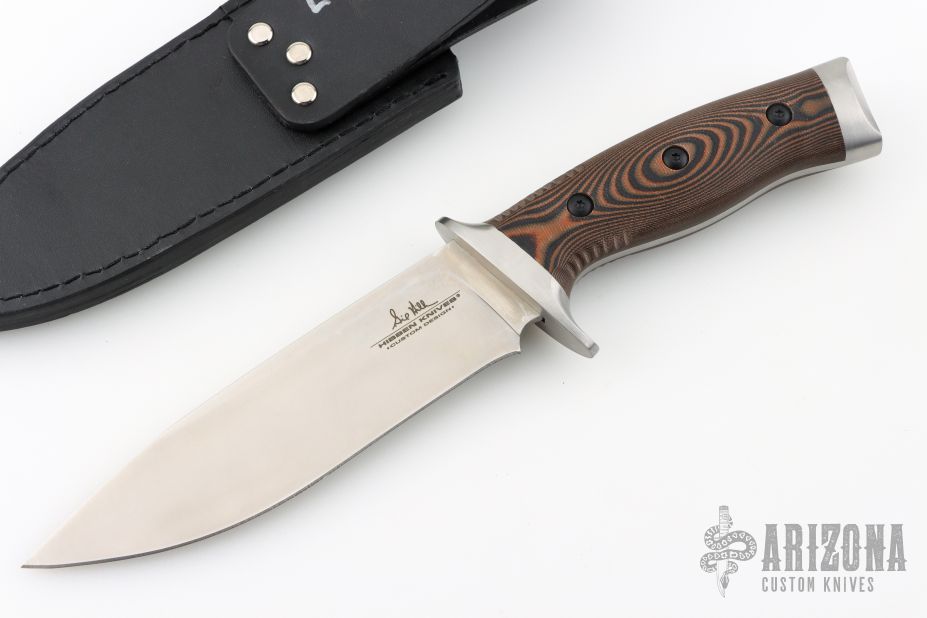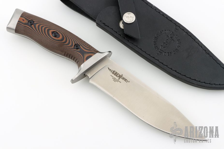 This knife was designed by master knife maker Gil Hibben, an avid hunter and fisherman. His firsthand experience as an Alaskan hunting guide contributed to the design of this custom knife. It has a full-tang, 6 1/2” razor-sharp 420HC stainless steel blade, complemented by a stainless steel guard and pommel. The handsome CNC machined, layered Micarta handle scales have a knothole pattern and are secured to the tang by heavy-duty screws. The handle features ridges just below the handguard to improve control when using the knife. The 11” overall length, fixed blade knife slides securely into a premium black leather belt sheath with a snap closure. When it comes to knives, Gil Hibben always knows exactly what you need!  Comes with original black leather sheath. Has some light scratches, otherwise excellent condition.