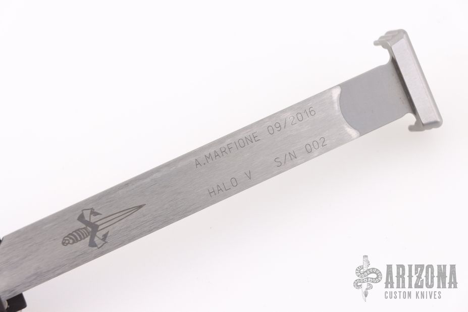 This Halo V by Marfione Custom Knives features a mirror polished blade with satin finished flats. The handle has black anodization, with blued Damascus face plate around the polish finished button, and bead blast finished hardware. Charging handle is stonewashed stainless steel dated 09/2016 s/n 002. Comes with original box, metal COA, and zipper case. Has a couple of marks on the body, excellent condition overall.