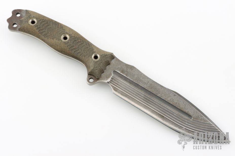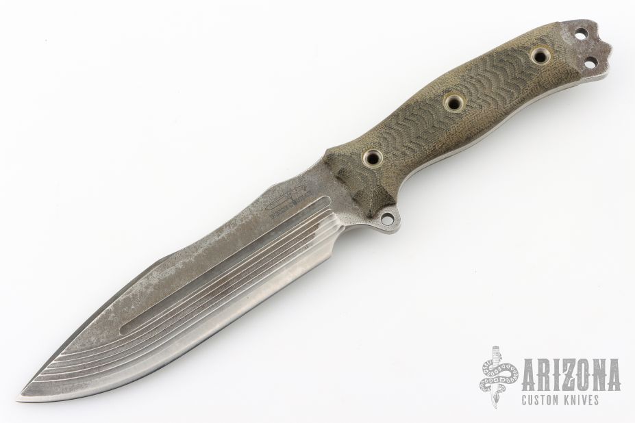 This Hell Razor by Busse Combat features a drop point blade that the coating has been removed, .189" blade stock and 1.766" blade depth, full tang construction. The handle has black canvas micarta scales with hollow tube pins, and an extended tang with lanyard hole. Excellent condition.