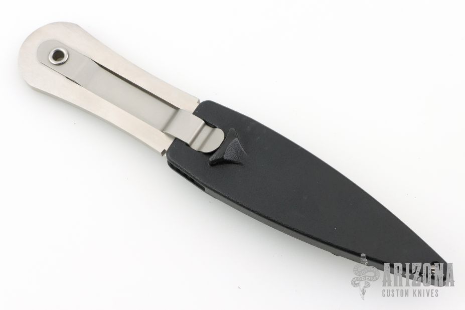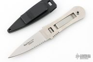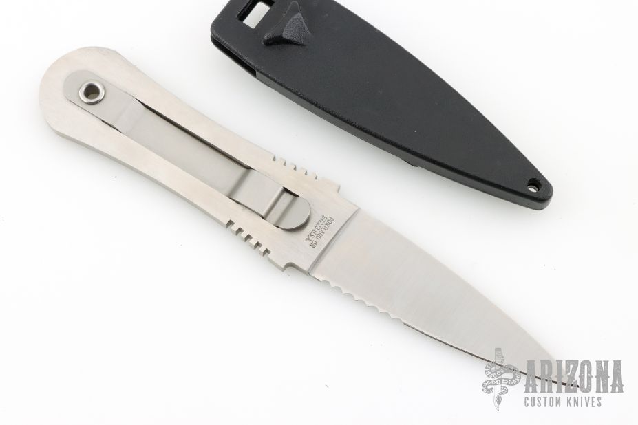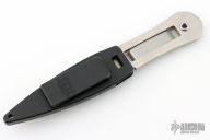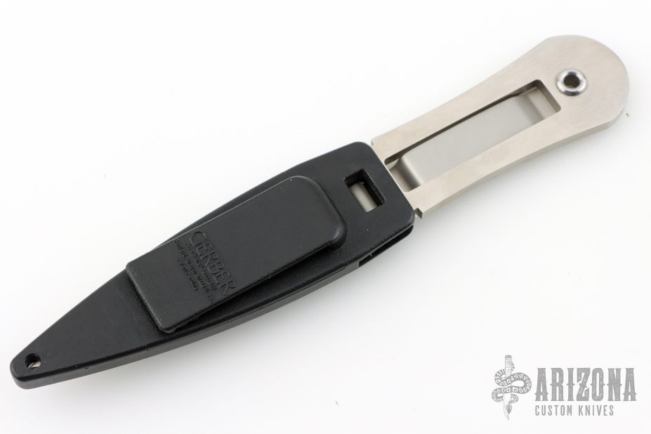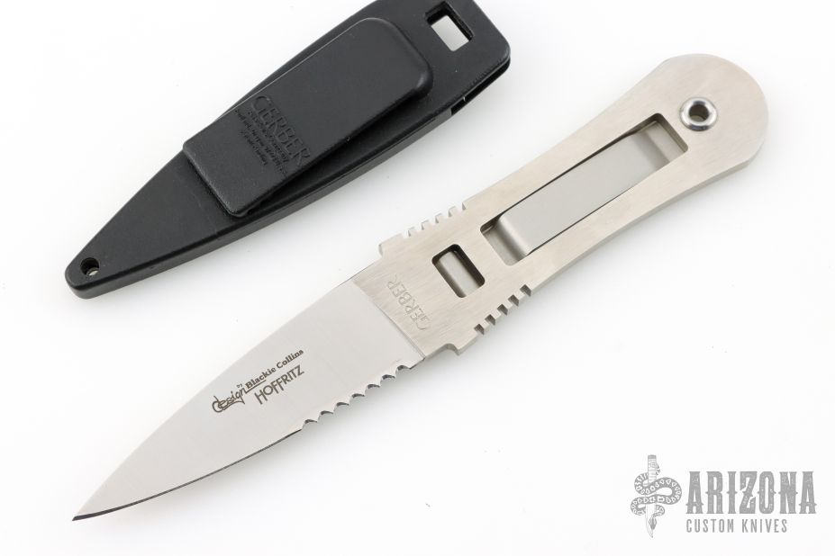 This boot knife by Gerber is a Blackie Collins design made for Hoffritz. It features a satin finished blade with partially serrated edge, .169" blade stock and 1.075" blade depth, full tang construction. The handle has a clip that holds it in the sheath. Comes with black plastic sheath. Excellent condition.