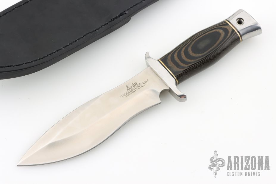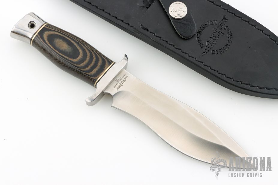 Gil Hibben lives and works in LaGrange, Kentucky. He began making knives part-time after his discharge from the Navy in 1956. He sold his first bowie knife for $45 and that sparked his long and famous career as a professional knife maker. While living in Seattle, WA after his Navy discharge, Gil worked as a machinist for Boeing Aircraft and learned a lot about metals and their properties. In 1964, while living in Salt Lake City, Utah, Gil started making knives full time. This was also the year Gil started making knives from the relatively new 440C steel. Although it is the industry standard now, Gil believes he was the first custom knife maker to use 440C. Hibben has been a full time custom knifemaker since 1957. Over the years Gil achieved fame as a premier custom knife maker and his work has been featured in, and on the covers of, national gun and knife magazines. He has established a whos-who following of collectors including John Wayne, Elvis Presley, Steve McQueen, Sylvester Stallone and Steven Segal or world leaders such as Israel's Defense Minister Moshe Dayan, the Sultan of Brunei and Vice-President Dan Quayle. He has taught and influenced some of the other legendary knife makers such as S.R. Johnson, Harvey Draper and Buster Warenski among countless others. Hibben designed the first line of Browning hunting knives in 1968, the American Kenpo Knife for Ed Parker. Gil's fame dramatically increased in 1988 when Sylvester Stallone, who had purchased several of Gil's custom knives for his own collection, asked Gil to design the now famous knife used in the movie Rambo III. Inducted into the Blade Magazine Cutlery Hall of Fame in 1990.