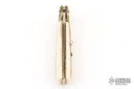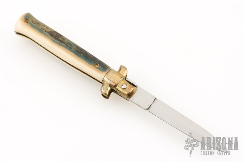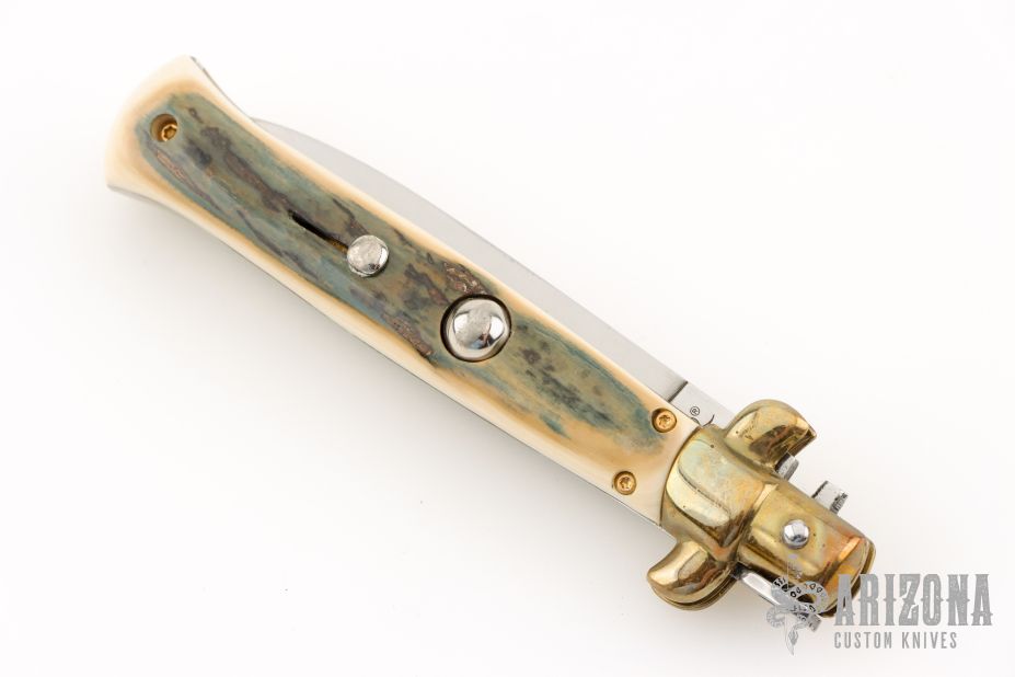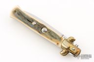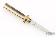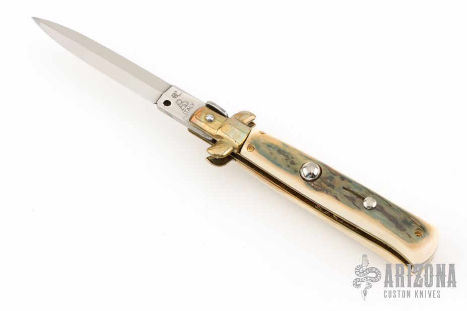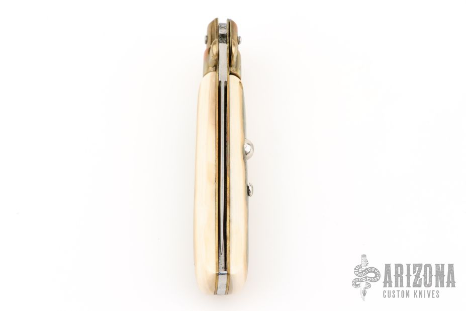 This Swivel Bolster Auto from AB Italy features a flat ground dagger blade with false top edge. The handle is comprised of stainless brass bolsters with mammoth ivory scales over brass liners and stainless steel backspacer. Gold plated screws, signed by the maker in the liner as well as 6/14/22 and AIK. comes in a nylon belt sheath. Has a couple light scuffs, otherwise Excellent condition.