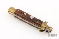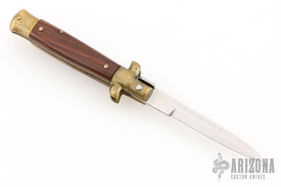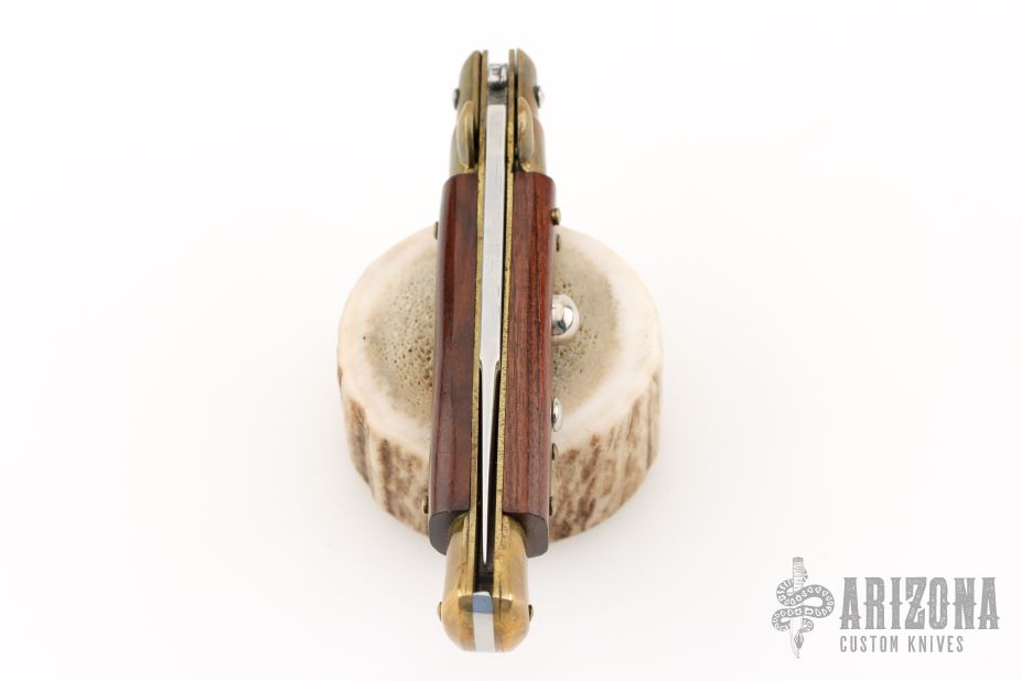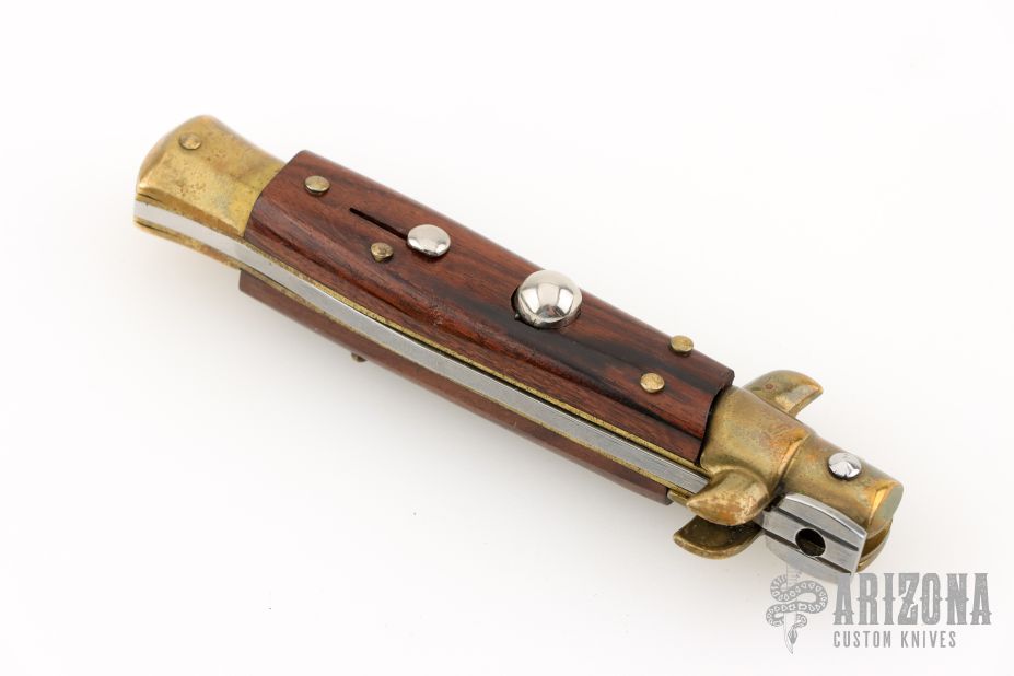 This Swivel Bolster Auto features a spear point blade. The handle consists of brass bolsters and cocobolo scales over brass liners and stainless steel backspacer. Has a little patina and some scratches, otherwise excellent condition.