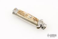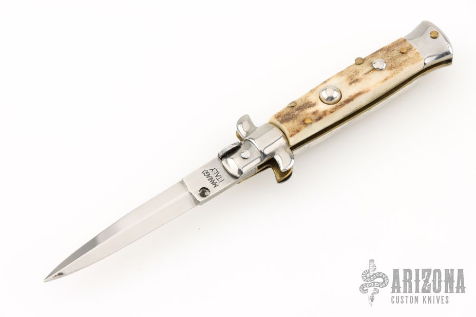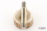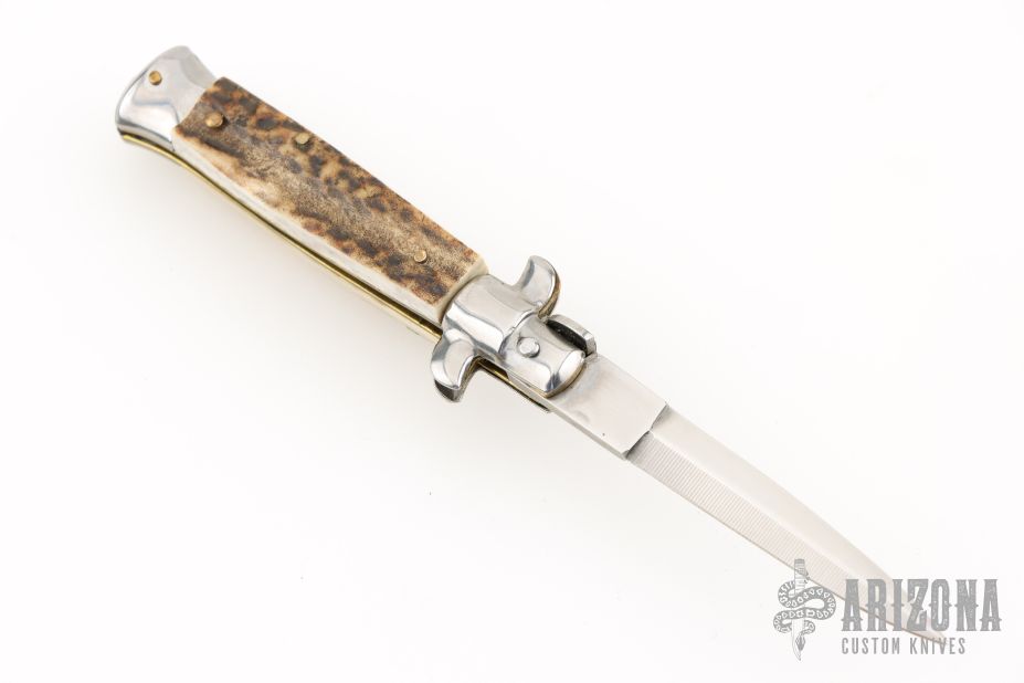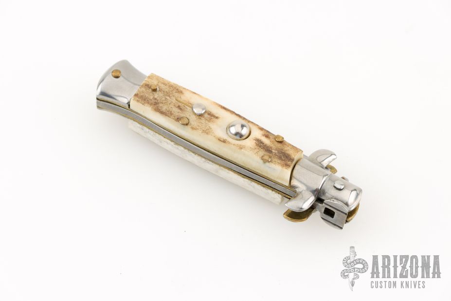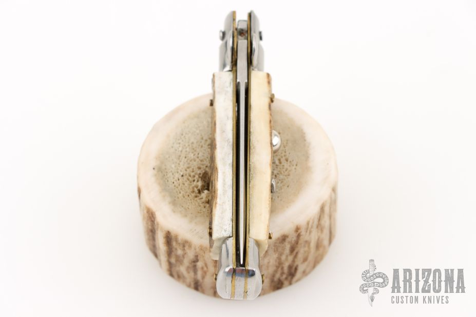This small swivel bolster features a stonewash/polish finished dagger blade with false top edge. Stainless steel front and rear bolster and stag scales. Brass liners. Nice function, strong firing. Excellent condition.