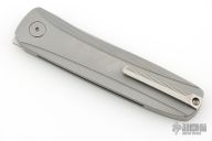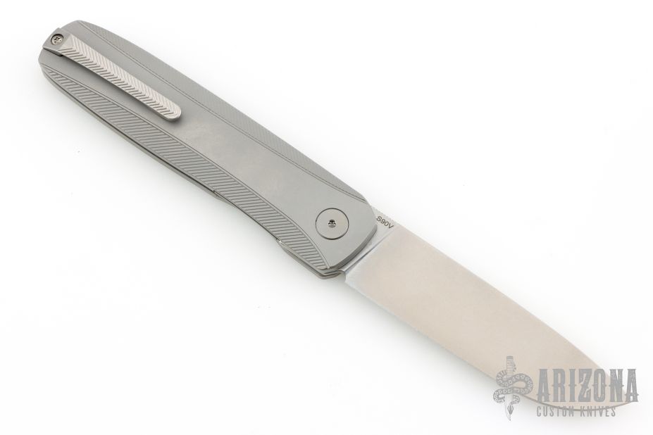 This knife features a stonewashed drop point blade. The handle has bead blasted titanium frame with a matching milled tip up pocket clip. Includes the original box. Excellent Condition.