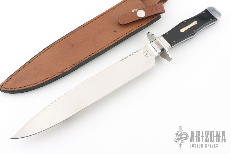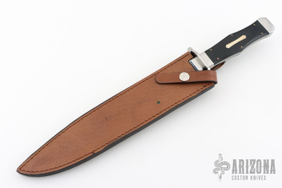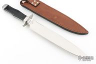 This Bowie by Kissing Crane features a satin finished blade with fileworked spine, .157" blade stock and 1.595" blade depth, hidden tang construction. The handle has a stainless steel guard and frame with black scales and nickel silver escutcheon. Comes with a brown leather sheath. Excellent condition.