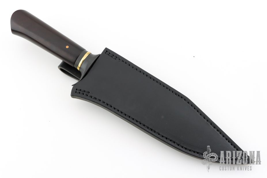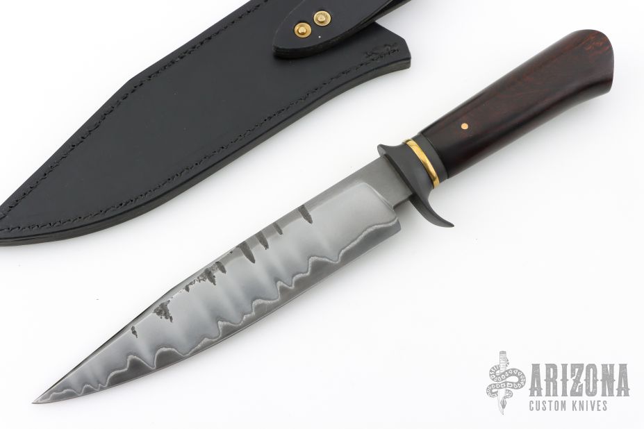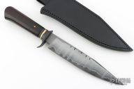 This Fighter by Journeyman Smith James Fleming features a San Mai blade with false top edge, hammer marks, .254" blade stock and 1.539" blade depth, hidden tang construction. The handle has a perkerized guard, polished brass spacer, very nice ironwood grip with single pin. Comes with a black leather sheath. Excellent condition.