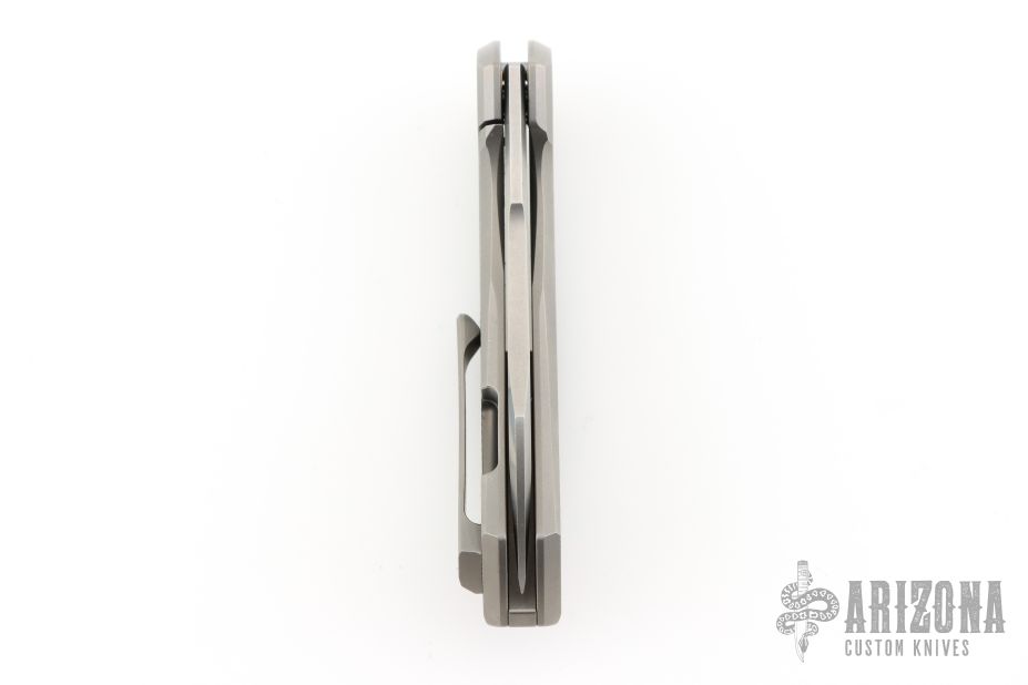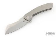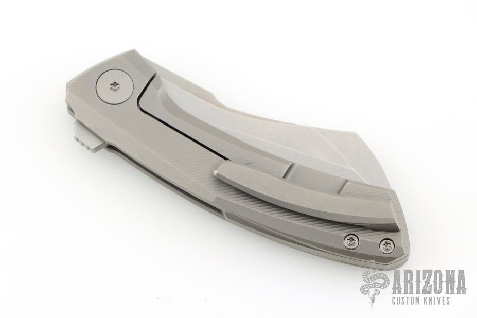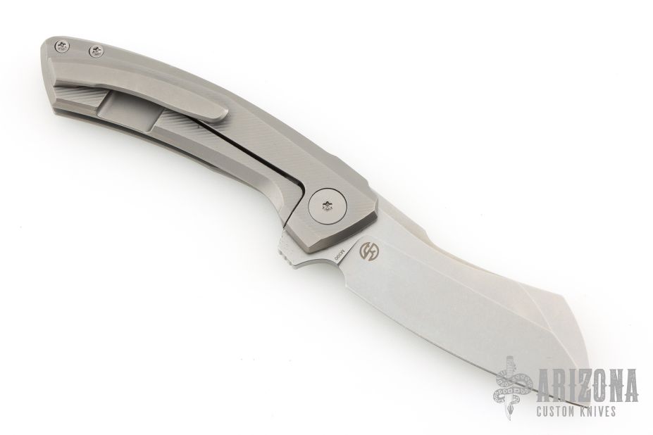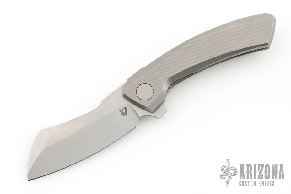 This Mini Cleaver by Vanguard Knives features a stonewashed blade with notched flipper. The handle has a milled titanium frame with a tip up titanium clip and backspacer. Comes with original box and COA. Excellent condition.