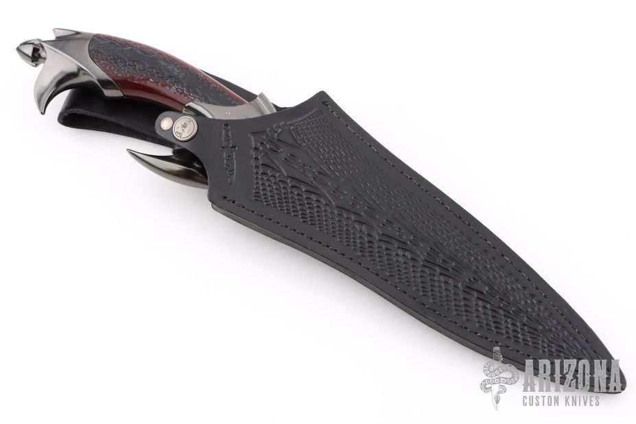 This Gil Hibben Jackal by Untied Cutlery features a satin finished blade with false top edge, .231" blade stock and 2.13" blade depth, hidden tang construction The handle has a darkened metal guard and butt with a carved simulated red bone grip. Comes with original sheath. Excellent condition.