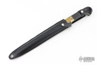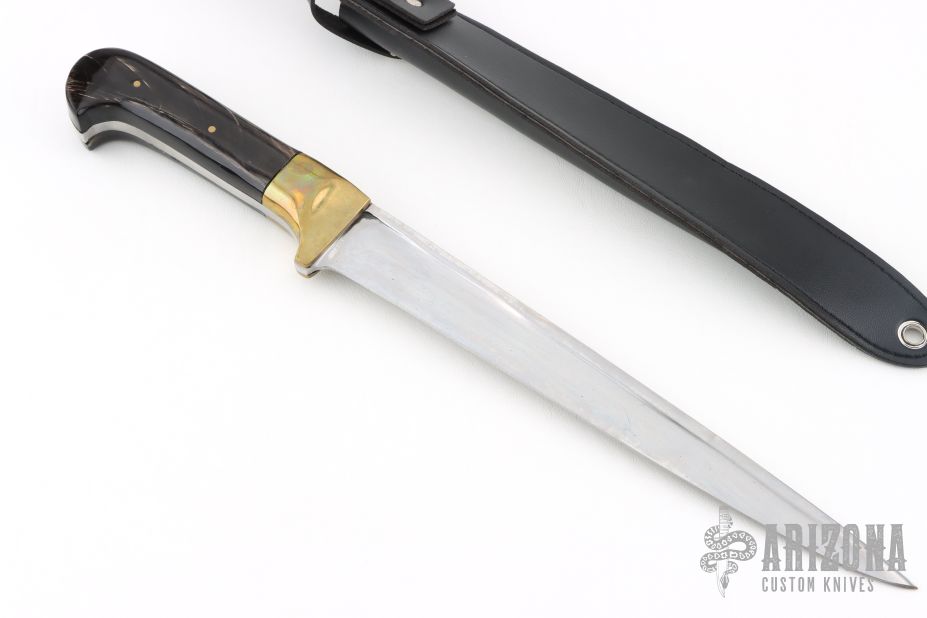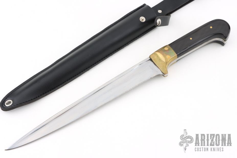 Made by Windlass Steelcrafts with a hand forged, 1060 high carbon steel blade.?The heavy T-section blade can pierce the stoutest armor and mail. The brass bolster is welded into place for strength and finished with thick water buffalo horn scales. Includes leather sheath with brass fittings.