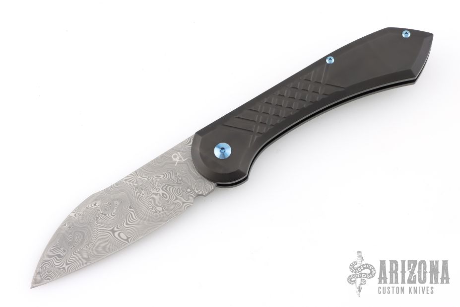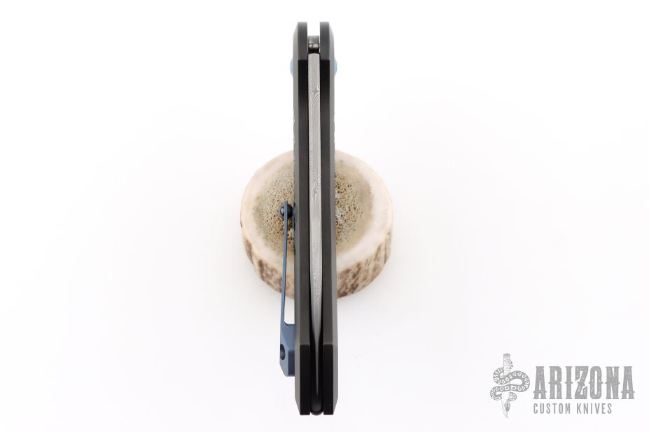 The handle will come in titanium with PVD coating and the Granade pattern, the titanium clip, all titanium screws will also be blue anodized. The spring will be rounded again and is also PVD coated.