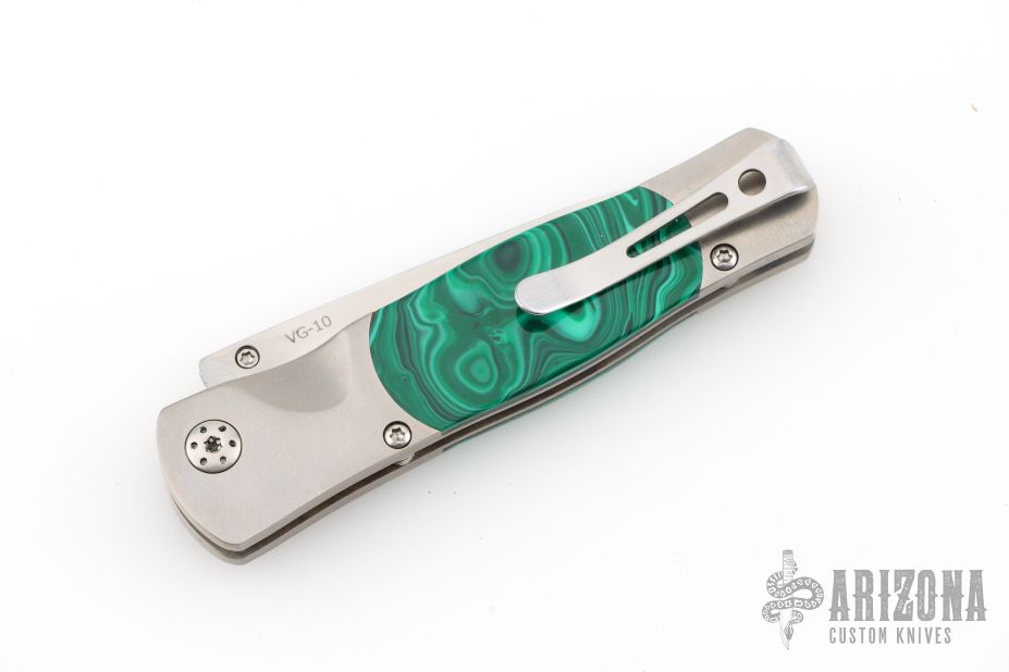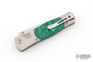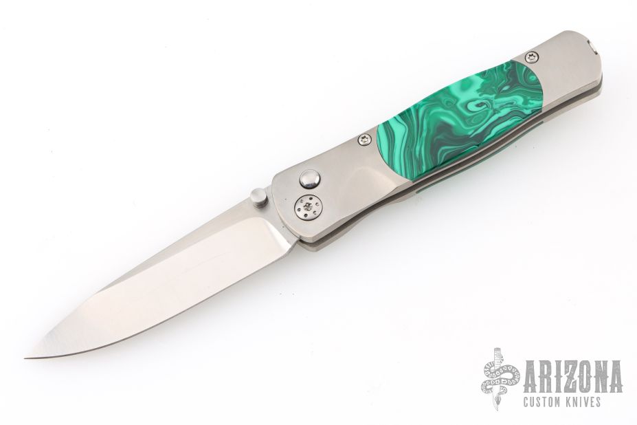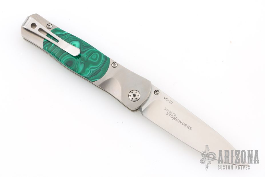 This Tesoro button lock folder by Santa Fe Stoneworks features a satin finished blade with single thumbstud. The handle has a satin finished titanium frame with stone inlays, g10 liners, and a tip up stainless steel clip. Comes with original box. Has a couple light scuffs, excellent condition.