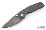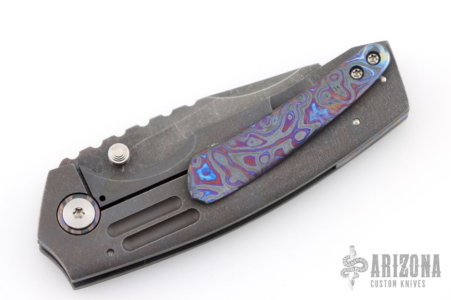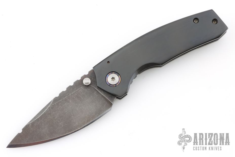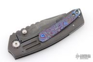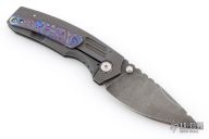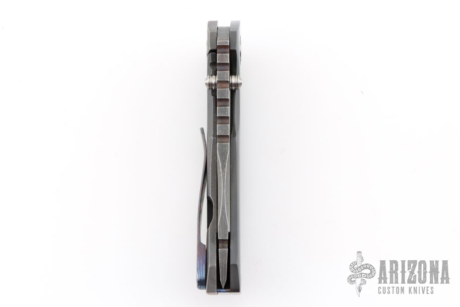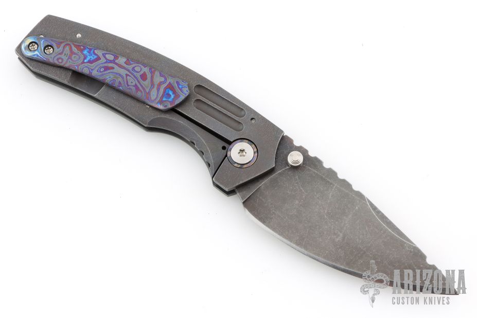 This Chupacabra Framelock by Old Dominion Knifeworks features a dark stonewash finished blade with a notched thumbrest and single thumbstud. The handle has a full zirconium frame with a Timascus backspacer and a matching tip-up pocket clip.  Timascus pivot collars. Nice detent, lockup and blade seating, rides on bearings.  Comes with a COA dated "2022".  Comes with a zippered case.  Excellent condition.