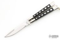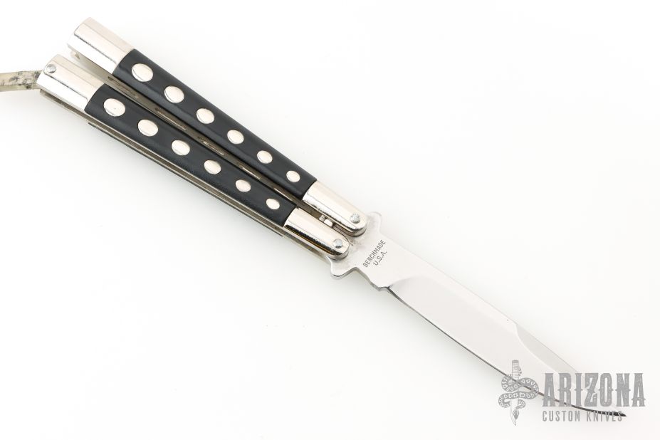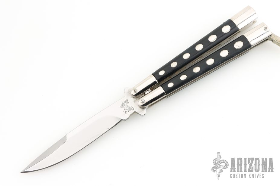 This Balisong by Benchmade features a polished Weehawk blade with false top edge. The handles are chrome plated zinc with black plastic inlays. Has some light scratches, otherwise excellent condition.