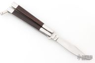 This Bowie Balisong by Pacific Cutlery features a satin finished blade ground by Jody Samson. The handle is comprised of integral dovetailed stainless steel handles with wood inlays. T latch on pommel. Has some light scratches, excellent condition otherwise.