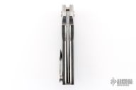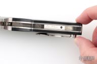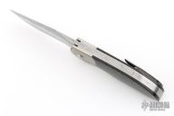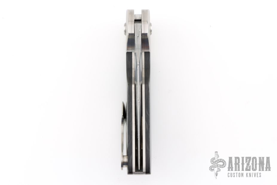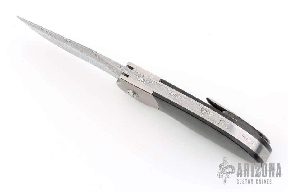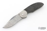 This Non-Flipper Flipper by Stan Wilson features a Damasteel blade with a false top edge. The handle has orange peel finished titanium bolsters, marbled carbon fiber scales, satin titanium liners with jeweled interiors, Damasteel backspacer, tip up orange peel finished titanium clip with hidden screws. The only visible hardware is the pivot. Nice action, lockup and blade seating.  Excellent condition.
