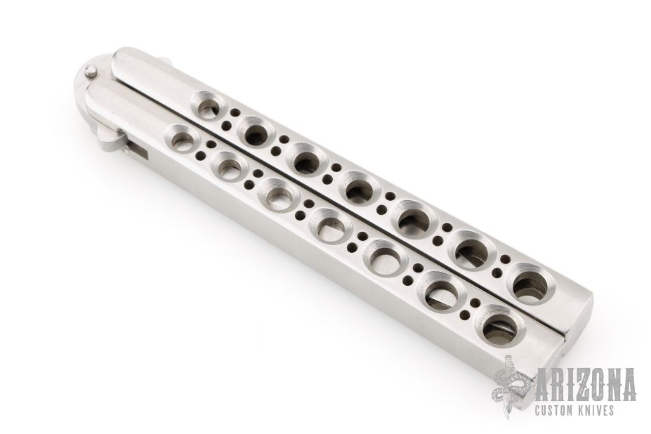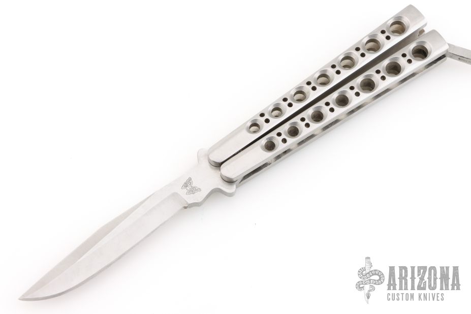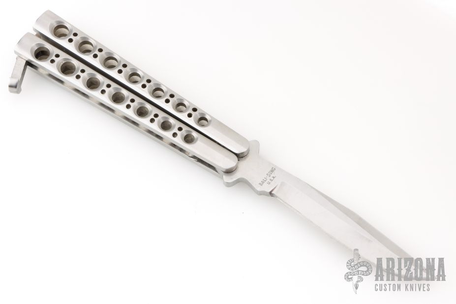 This early balisong from Pacific Cutlery features a Jody Samson ground satin finished blade with long clip point. The handles are stainless steel with hole pattern, has t-latch. Has a few light scratches, otherwise excellent condition.