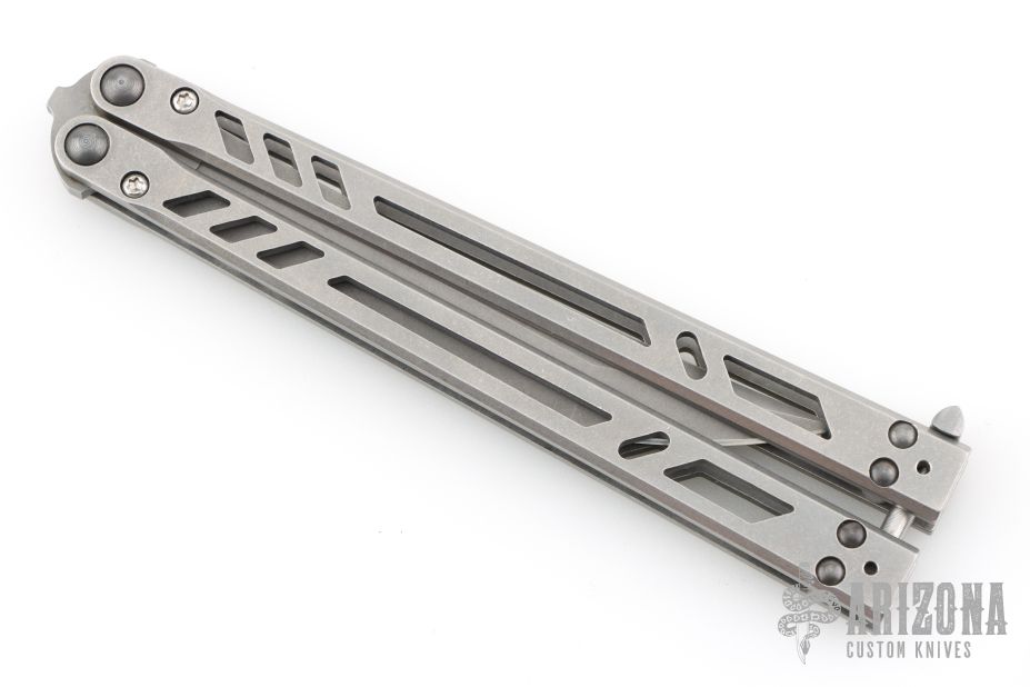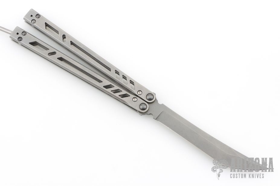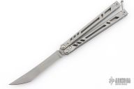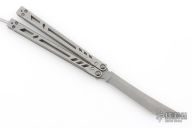 This Barebones Balisong by Blade Runner Systems features an upswept stonewashed blade. The handle is comprised of tumble finished machined steel construction with a matching "T" latch. Comes with original box and papers. Has a few light scuffs, excellent condition otherwise.