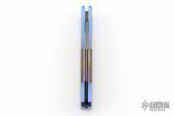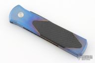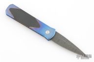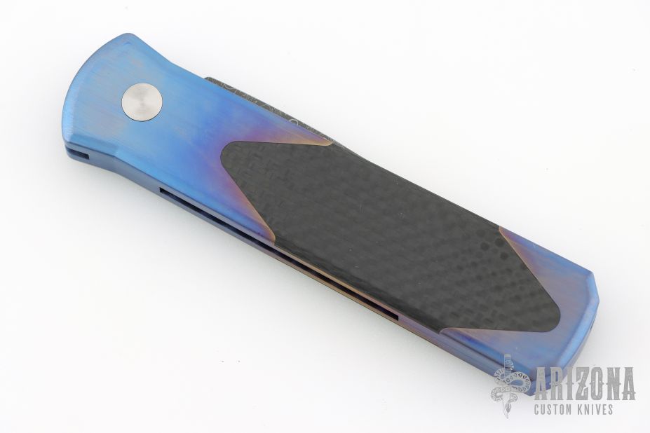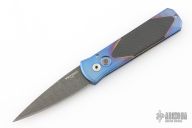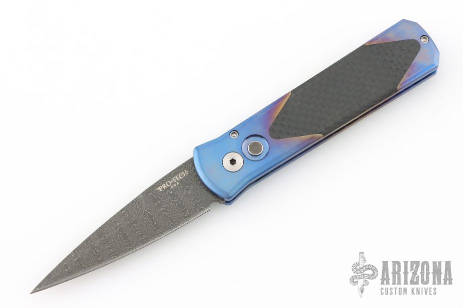 This Custom Titanium Godson by Pro-Tech features the quality and tremendous strength of aerospace grade titanium and a level of fit and finish rarely seen. Each of these pieces starts out as solid 6al4V titanium bar stock. The handles are precision machined then completely hand finished. Carbon fiber inlays are fit to be seamless with the frame. This Custom Titanium Godson features a Devin Thomas "Houndstooth" Damascus blade. Carbon Fiber inlay in push button. Excellent condition. Comes with original box and papers.