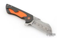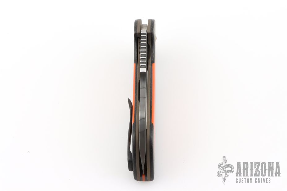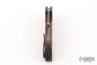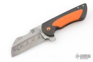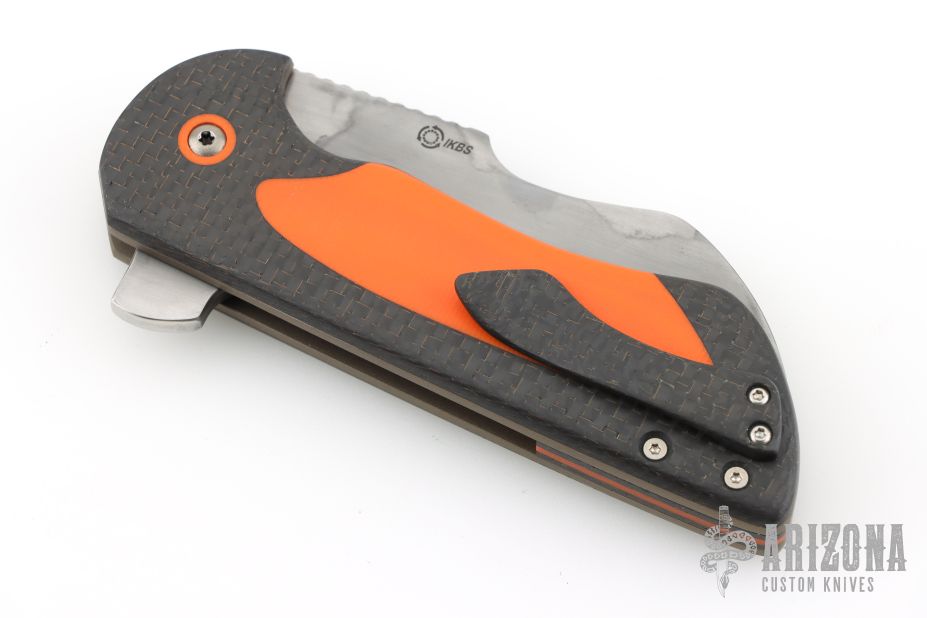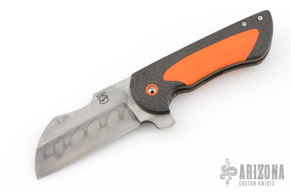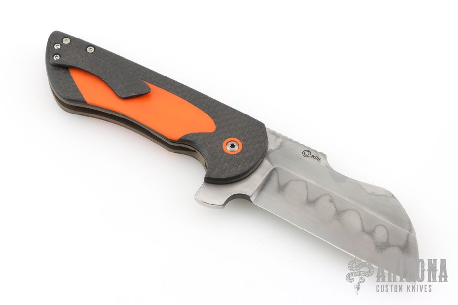 This Flipper from Michael Burch of Burchtree Bladeworks features a sheepsfoot blade with hamon and flipper. The handle carbon fiber scales with a matching tip up pocket clip over titanium liners.  Orange G10 scales. G10 and carbon fiber laminated backspacer. Excellent Condition.
