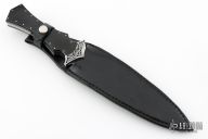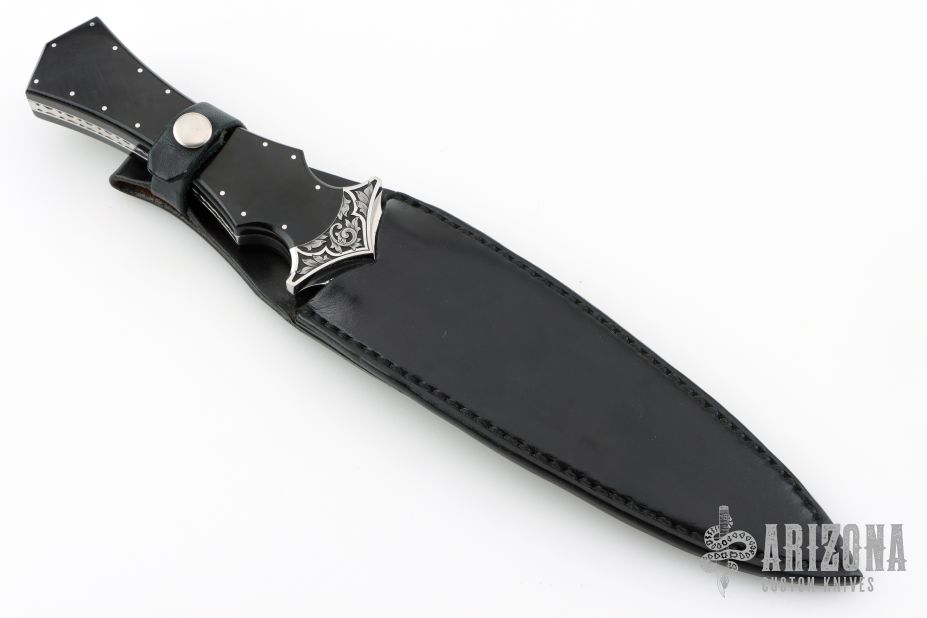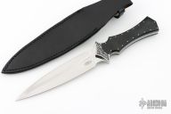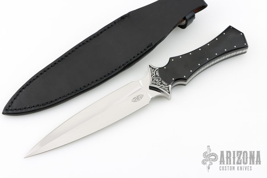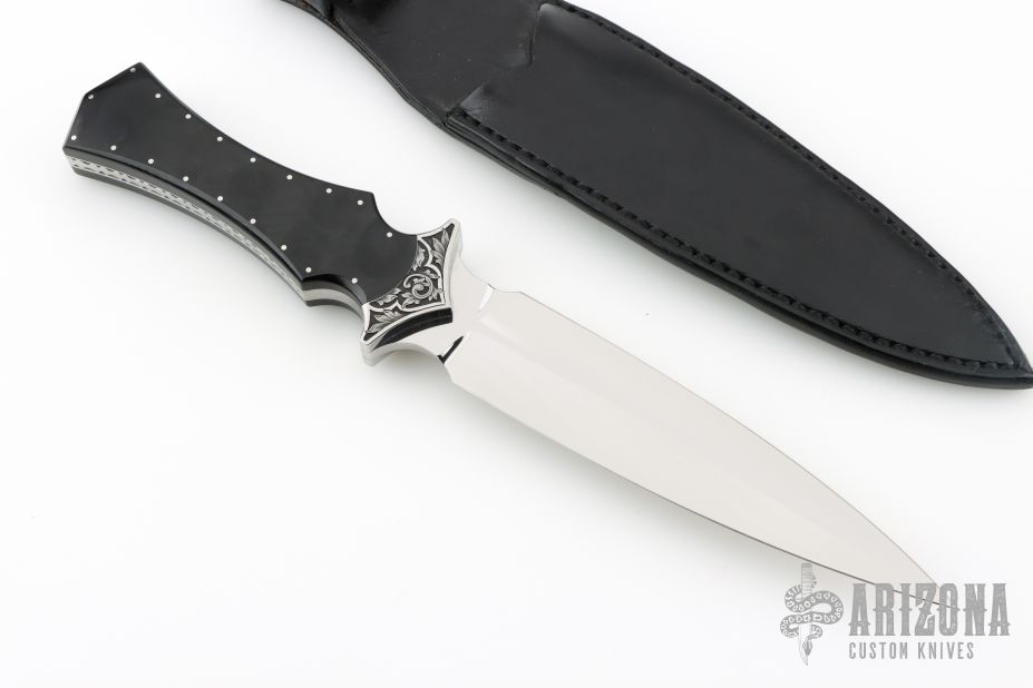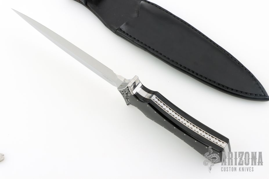 This Dagger by Bill Duff features a mirror polished double edged blade with .180" blade stock and 1.41" blade depth, full tang construction. The handle has engraved steel bolsters, black linen micarta scales, decorative steel pins, fileworked tang. Comes with a leather sheath. Excellent condition.