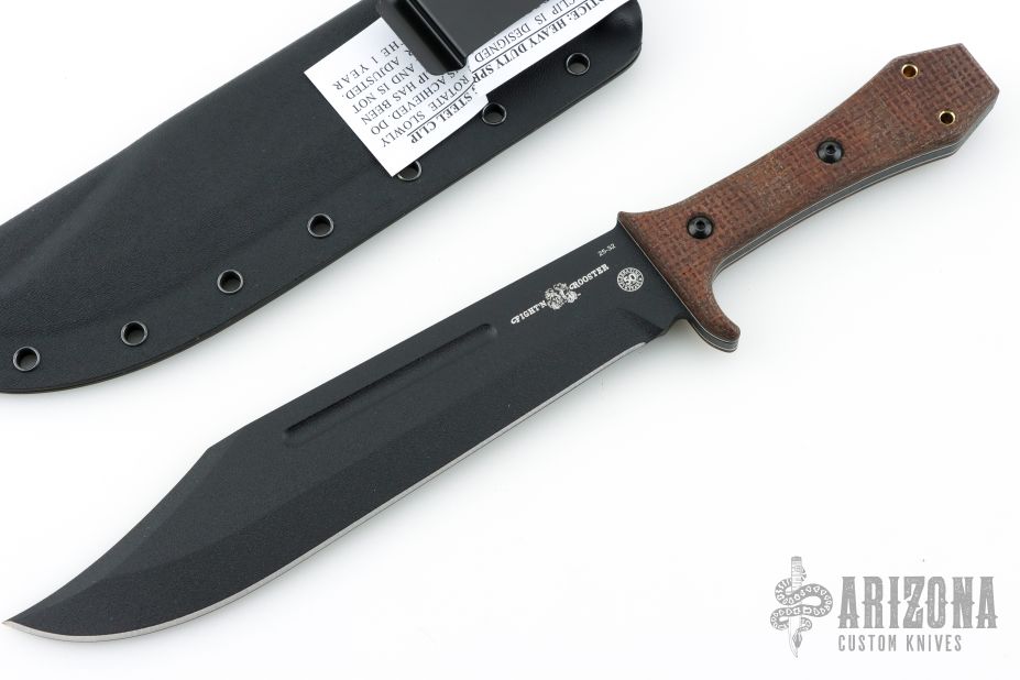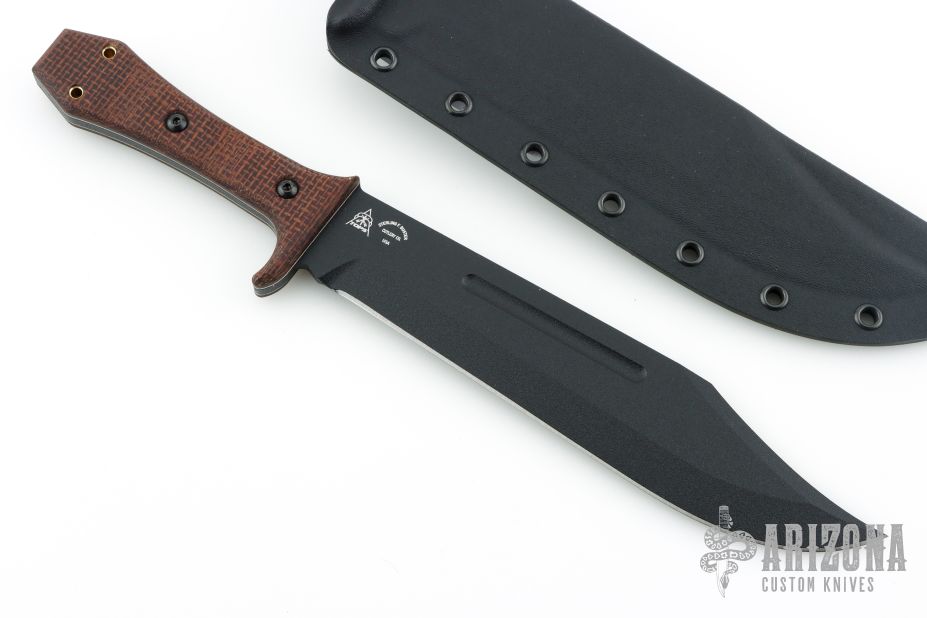This Walkabout Bowie by Tops and Sterling F. Buster Cutlery Co. was made for Fight'n Rooster. It features a Black Traction Coated blade with fullers and false top edge, .195" blade stock and 1.759" blade depth, full tang construction with burlap micarta scales with white liners. Comes with a kydex sheath with belt clip, and original packaging. New from maker. #25-32