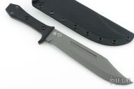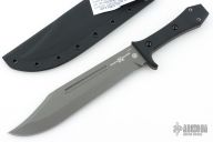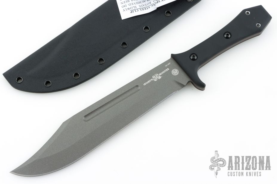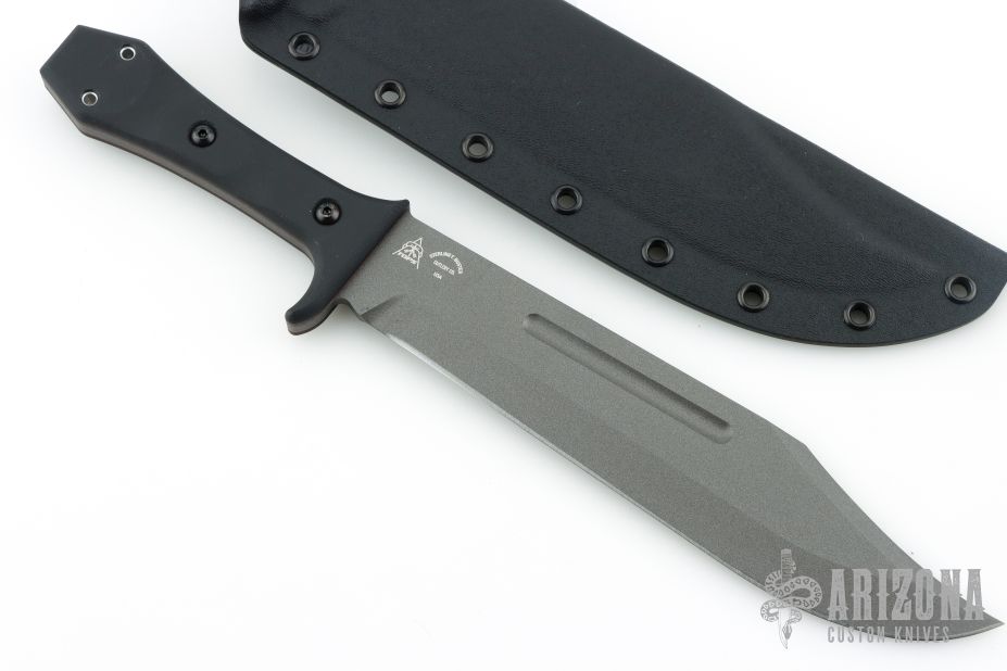 This Walkabout Bowie by Tops and Sterling F. Buster Cutlery Co. was made for Fight'n Rooster. It features a Tungsten Cerakoted blade with fullers and false top edge, .188" blade stock and 1.764" blade depth, full tang construction with black G-10 scales with red liners. Comes with a kydex sheath with belt clip, and original packaging. New from maker. #25-097