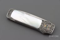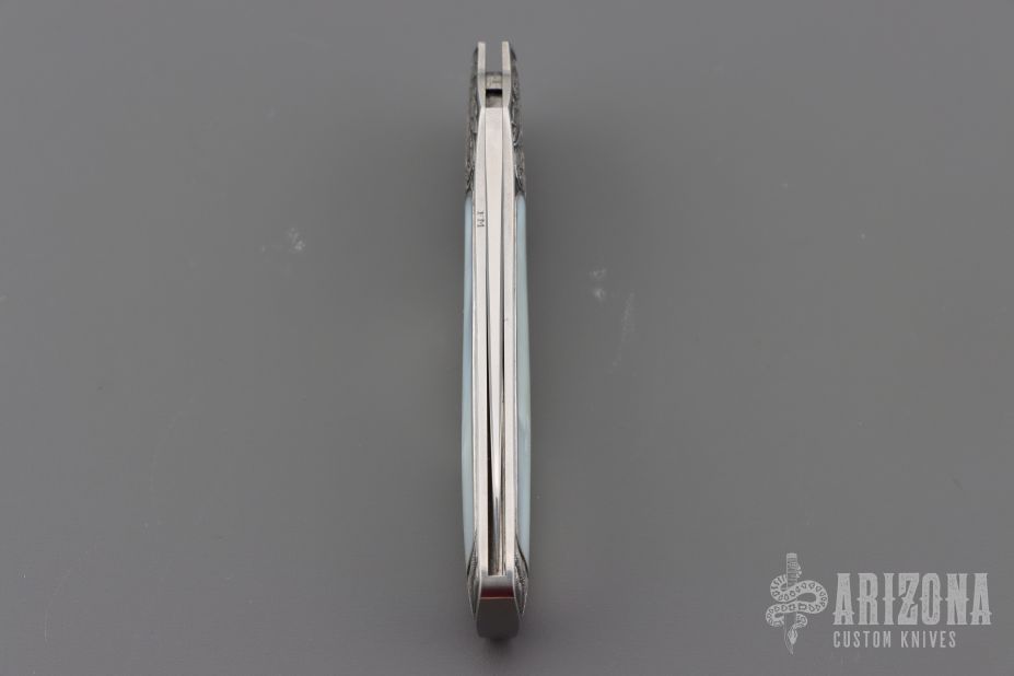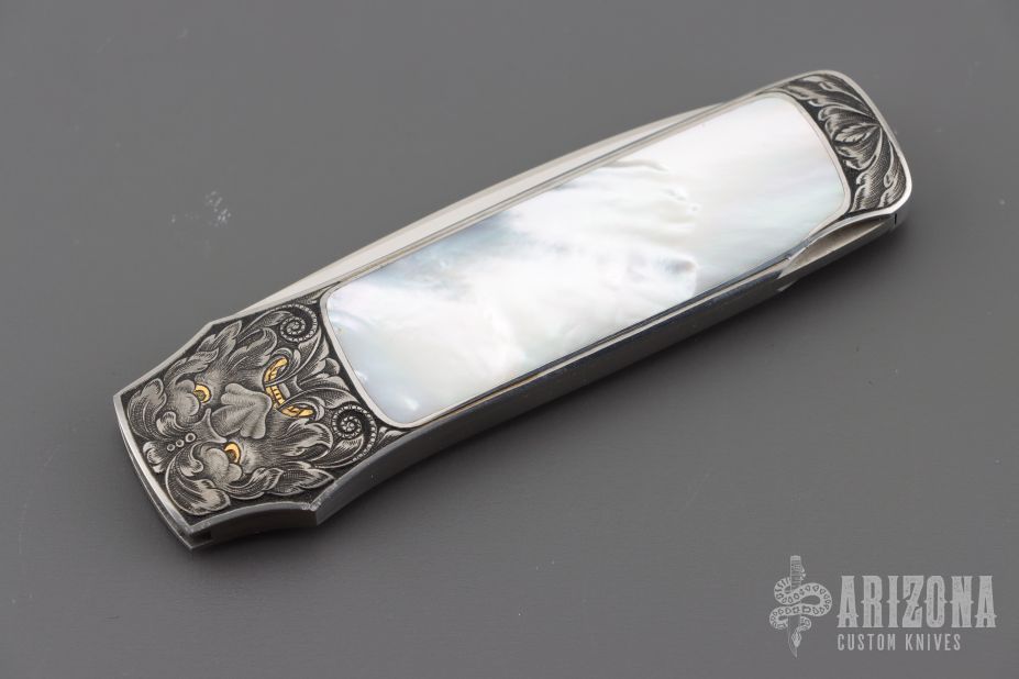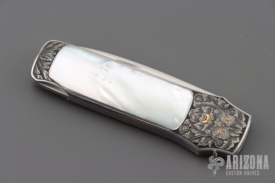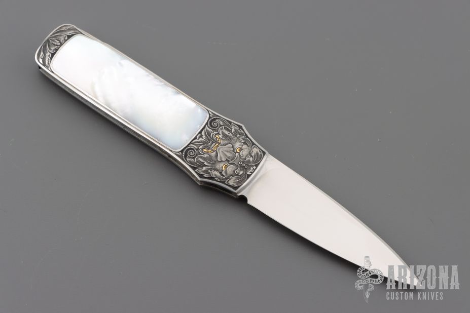 This Interframe Lockback by Steve Hoel features a hand rub satin finished blade with nail nick. The handle has a 416 stainless steel frame with mother of pearl inlays. The handle has been beautifully engraved by Franz Marktl with 24kt gold inlays with beautifully engraved faces. Nice lockup and blade seating. Excellent condition. Comes with a zippered case. "05" on the blade.