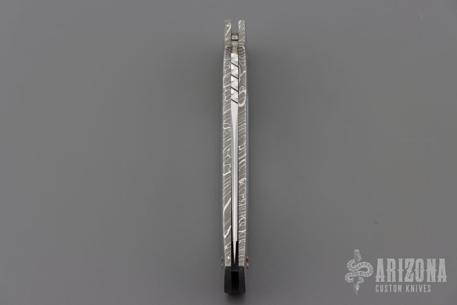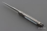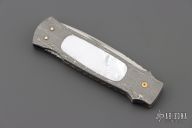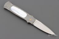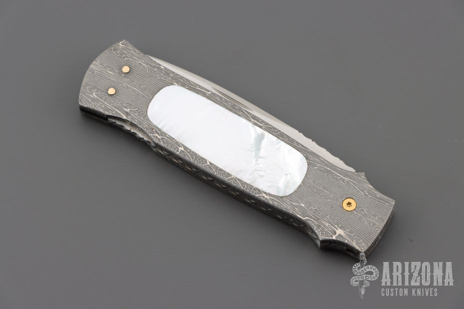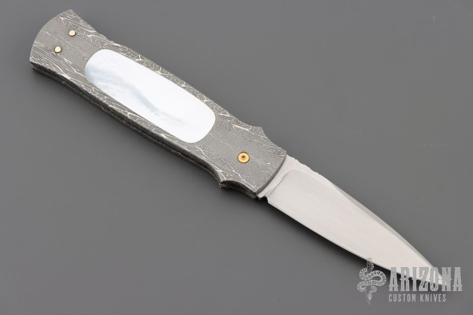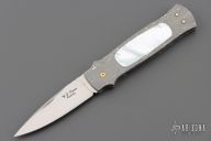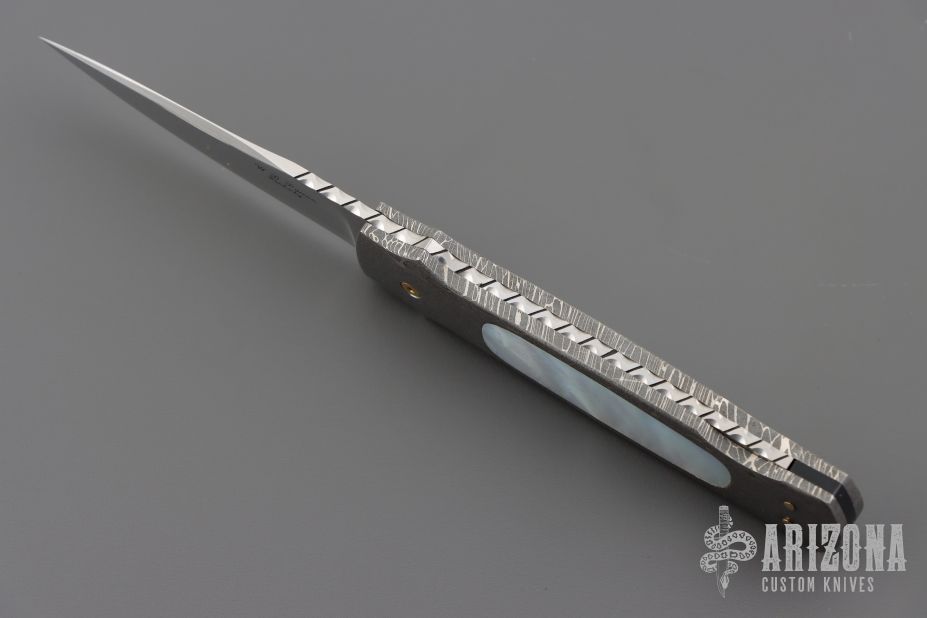 This knife features a hand rub satin finished blade with fileworked blade spine and a nail nick.  The handle has a Damascus frame, mother of pearl inlays, and a fileworked SS backspacer, gold pins and pivot screw. Comes with a zippered case. Nice lockup and blade seating. Excellent condition. "05im14"