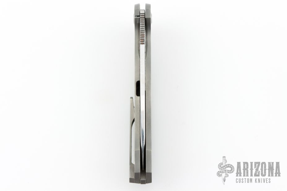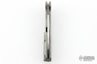 This knife by Cheburkov Knives features a Damasteel blade with notched thumbrest and flipper. The handle has a blasted titanium frame with wolf paws, a matching tip up pocket clip and backspacer. Nice detent and blade seating. Has some light scuffs and some minor lockrock, otherwise excellent condition. Includes the original box.  Dated 2021